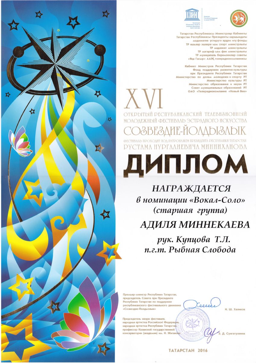 - Адиля Миннекаева - Диплом участника XVI-го открытого Республиканского телевизионного молодежного фестиваля эстрадного искусства "Созвезие-Йолдызлык" в номинации "Вокал-соло" (старшая группа). (2016г. УНИКС)