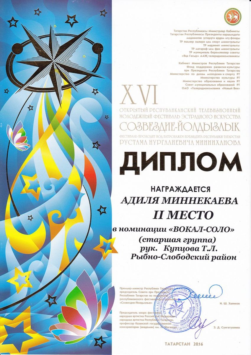 - Адиля Миннекаева - Диплом за II-е место XVI-го открытого Республиканского телевизионного молодежного фестиваля эстрадного искусства "Созвезие-Йолдызлык" в номинации "Вокал-соло" (старшая группа). (2016г.)