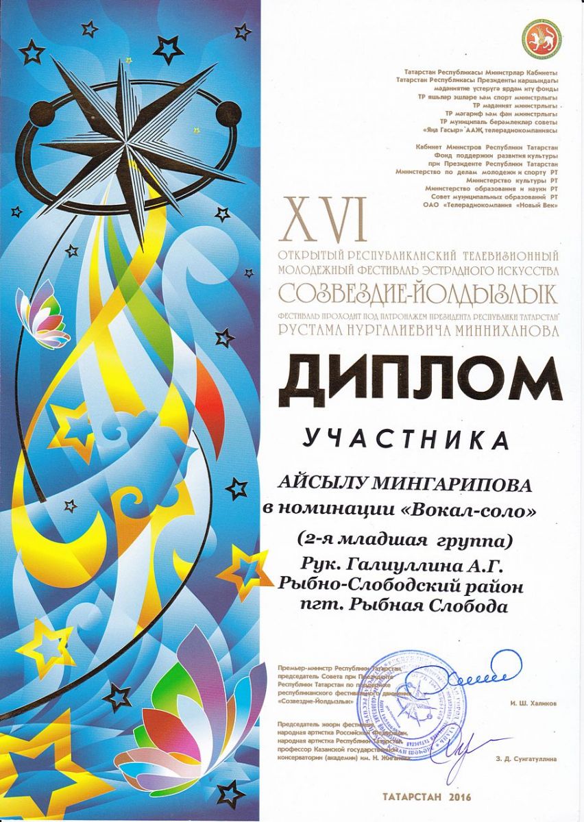 - Айсылу Мингарипова - Диплом участника XVI-го открытого Республиканского телевизионного молодежного фестиваля эстрадного искусства "Созвезие-Йолдызлык" в номинации "Вокал-соло" (2-я младшая группа). (2016г.)