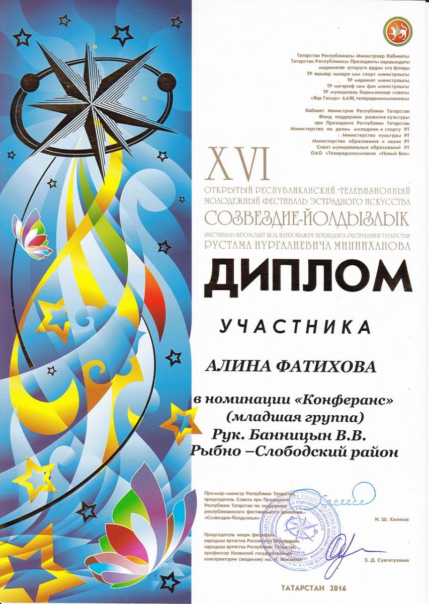 - Алина Фатихова - Диплом участника XVI-го открытого Республиканского телевизионного молодежного фестиваля эстрадного искусства "Созвезие-Йолдызлык" в номинации "Конферанс" (младшая группа). (2016г.)