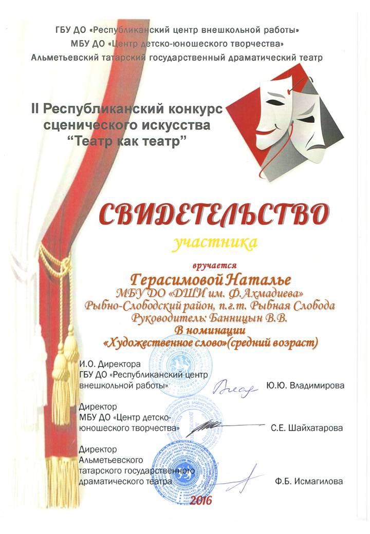 Наталья Герасимова - Свидетельство участника II-го Республиканского конкурса сценического искусства "Театр как театр" в номинации "Художественное слово (средний возраст)". (2016г.)
