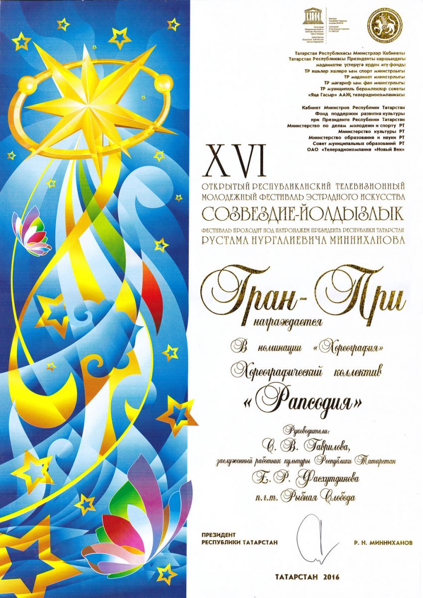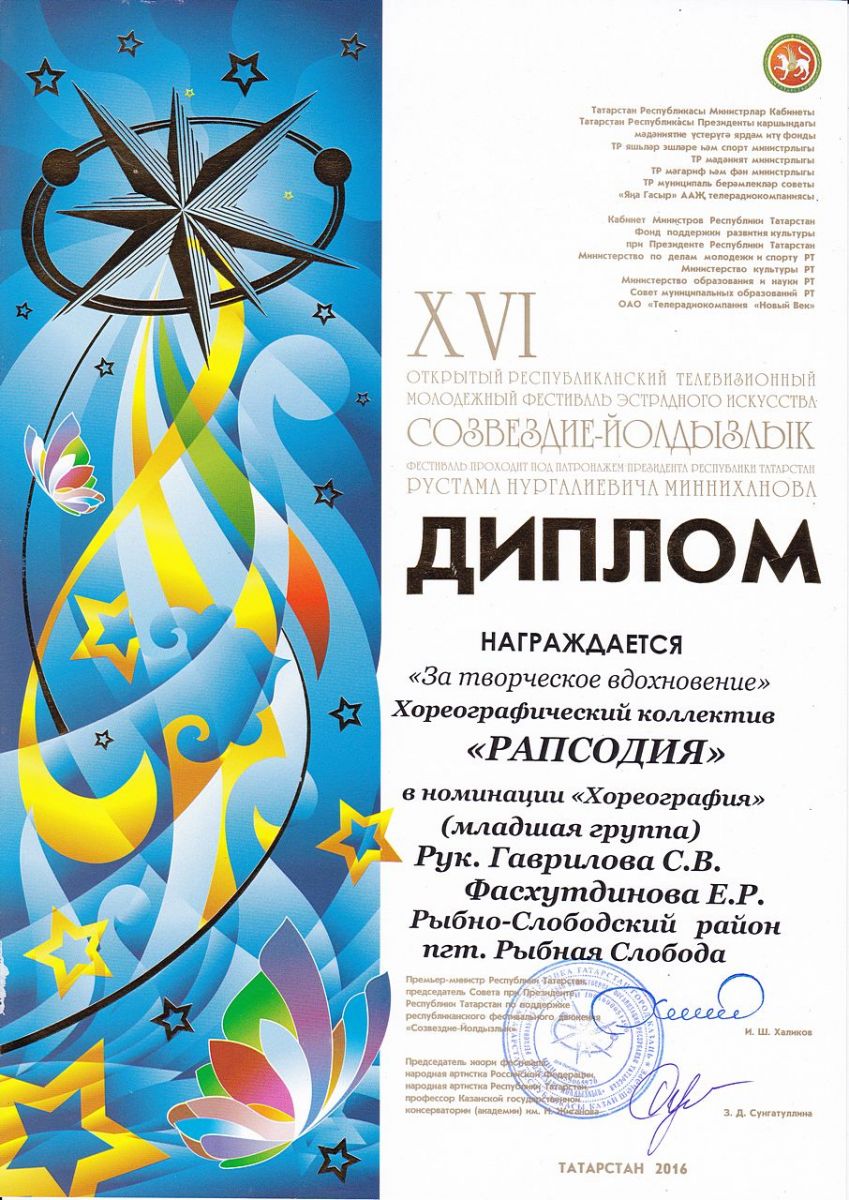 Хореографический коллектив "Рапсодия" - Диплом за I-е место XVI-го открытого Республиканского телевизионного молодежного фестиваля эстрадного искусства "Созвезие-Йолдызлык" в номинации "Хореография" (средняя группа). (2016г.)