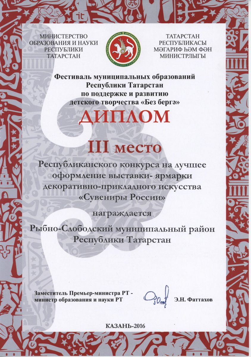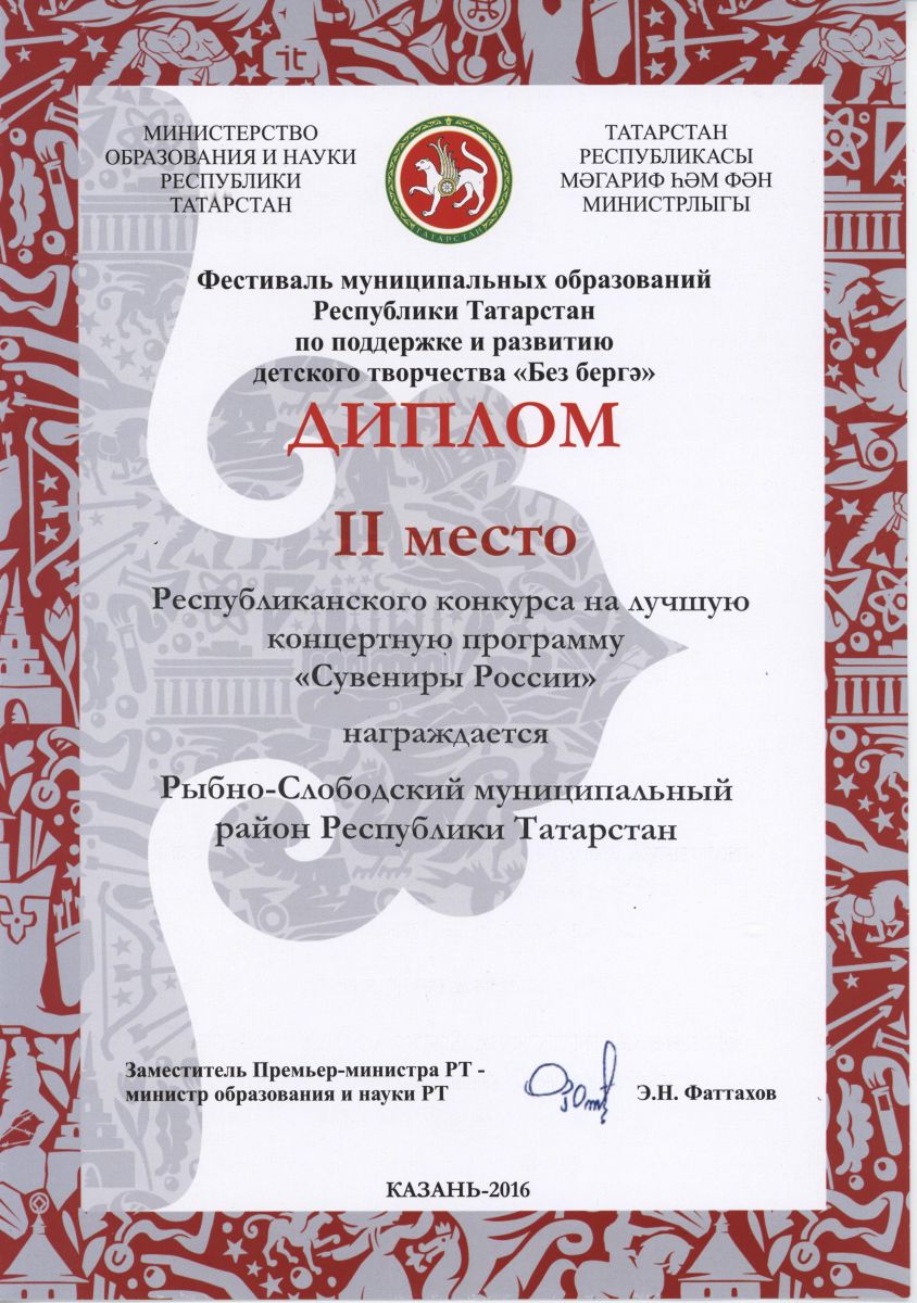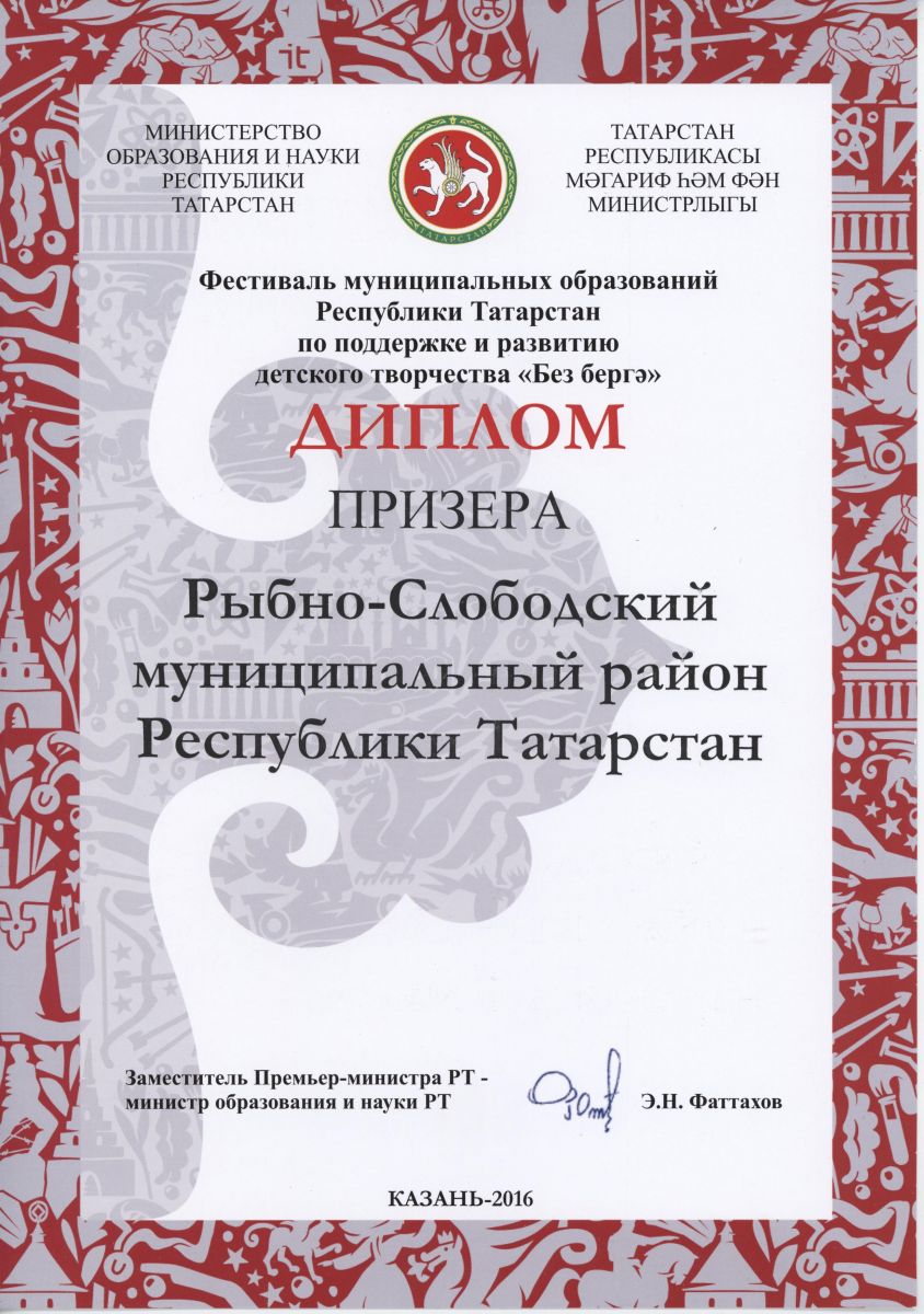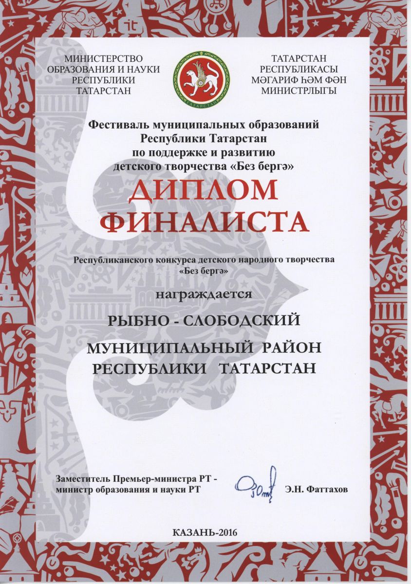 Диплом финалиста Фестиваля муниципальных образований Республики Татарстан по поддержке и развитию десткого творчества "Без берге" (2016г.)