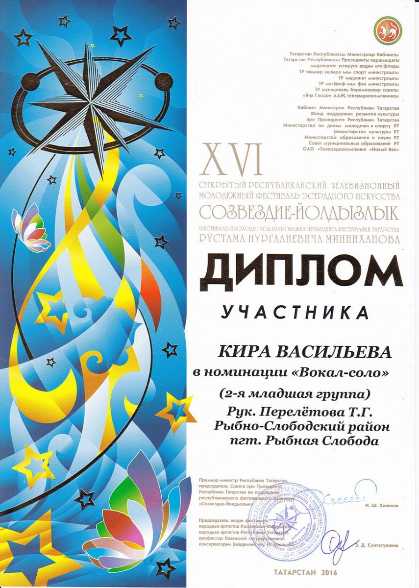 - Кира Васильева - Диплом участника XVI-го открытого Республиканского телевизионного молодежного фестиваля эстрадного искусства "Созвезие-Йолдызлык" в номинации "Вокал-соло" (2-я младшая группа). (2016г.)