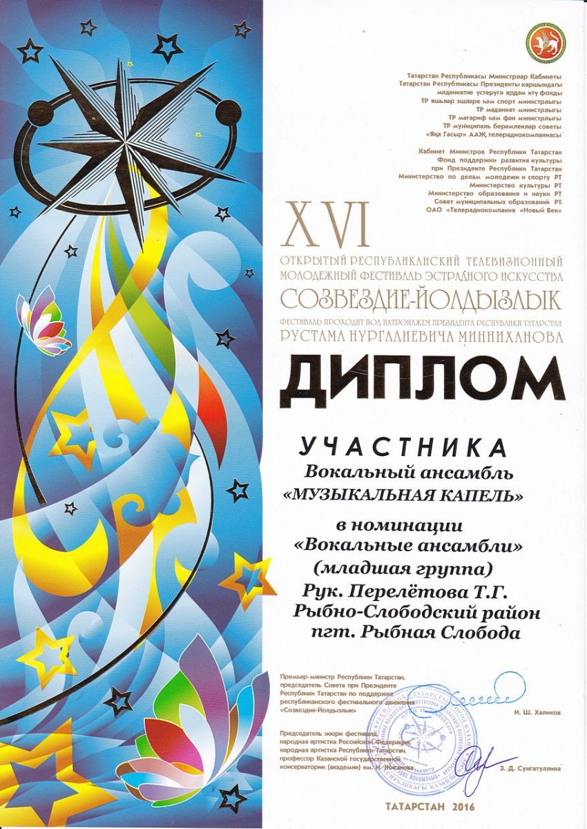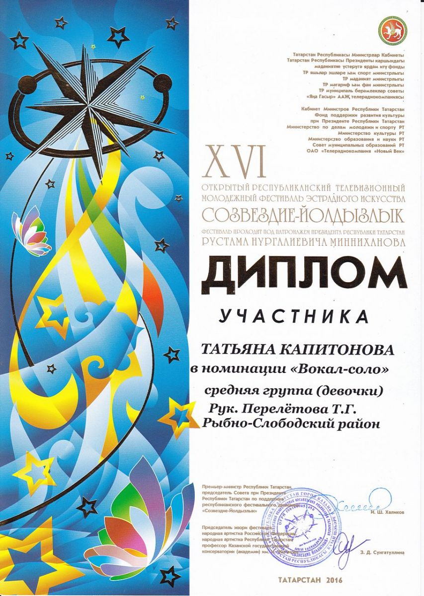- Татьяна Капитонова - Диплом участника XVI-го открытого Республиканского телевизионного молодежного фестиваля эстрадного искусства "Созвезие-Йолдызлык" в номинации "Вокал-соло" (средняя группа(девочки)). (2016г.)