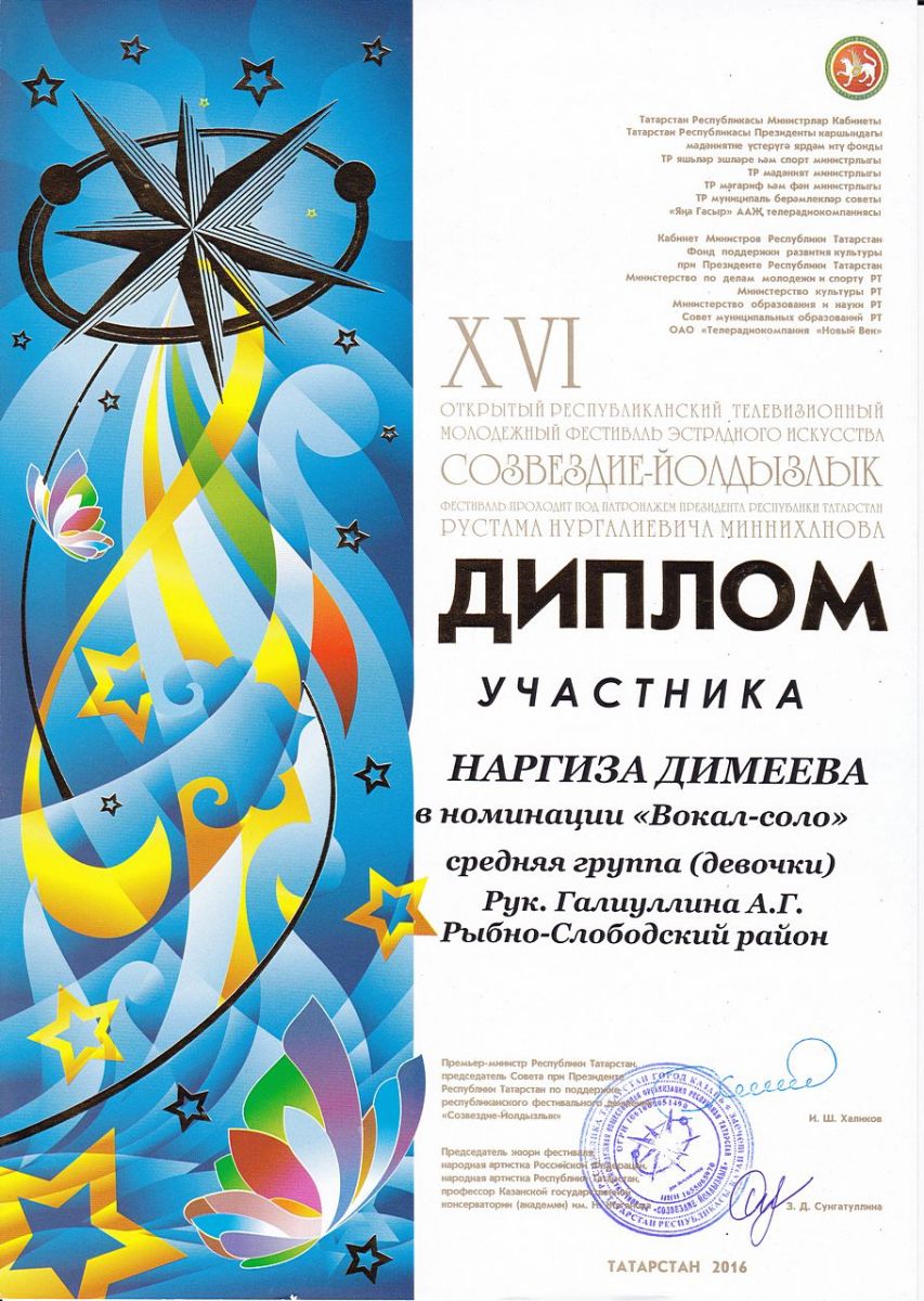 - София Нагимуллина - Диплом участника XVI-го открытого Республиканского телевизионного молодежного фестиваля эстрадного искусства "Созвезие-Йолдызлык" в номинации "Вокал-соло" (2-я младшая группа). (2016г. УНИКС)