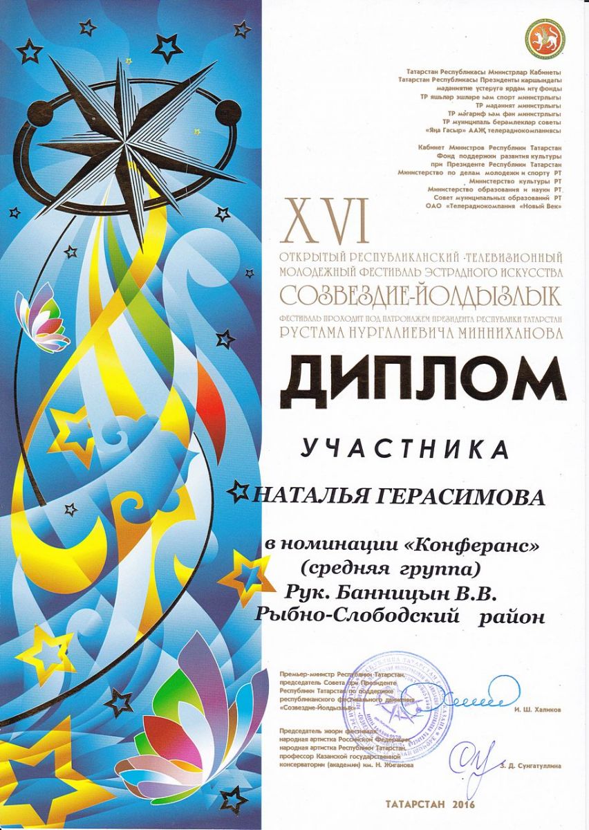 - Наталья Герасимова - Диплом участника XVI-го открытого Республиканского телевизионного молодежного фестиваля эстрадного искусства "Созвезие-Йолдызлык" в номинации "Конферанс" (средняя группа). (2016г.)