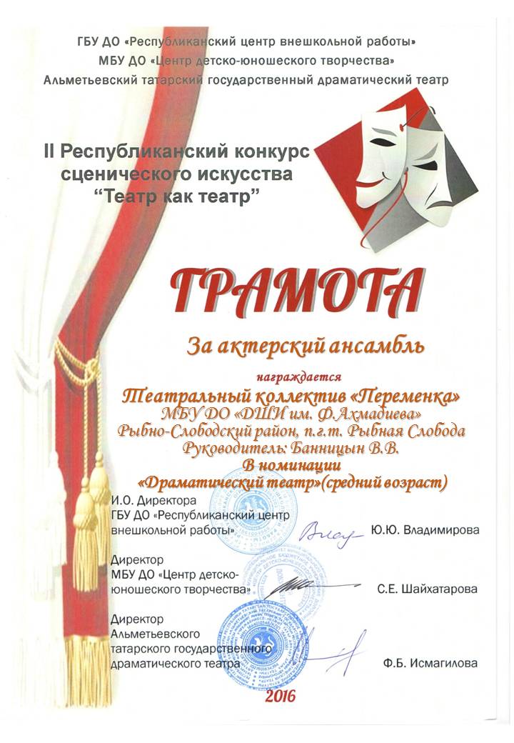 Театральный коллектив "Переменка" (Салават Сабиров, Наталья Герасимова, Станислав Мишин, Регина Шмелева и Константин Киселев) - Грамота II-го Республиканского конкурса сценического искусства "Театр как театр" в номинации "Драматический театр (средний возраст). (2016г.)