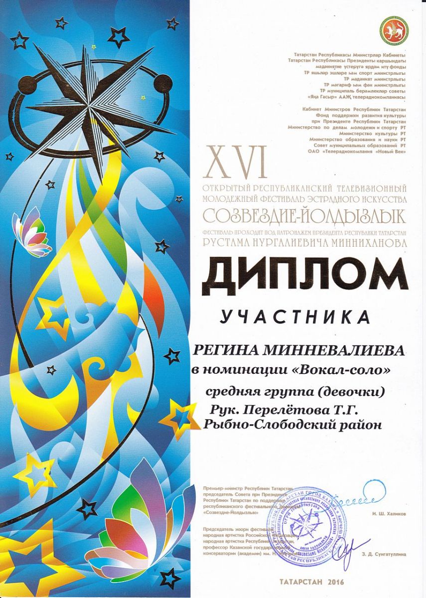 - Регина Минневалиева - Диплом участника XVI-го открытого Республиканского телевизионного молодежного фестиваля эстрадного искусства "Созвезие-Йолдызлык" в номинации "Вокал-соло" (средняя группа(девочки)). (2016г.)