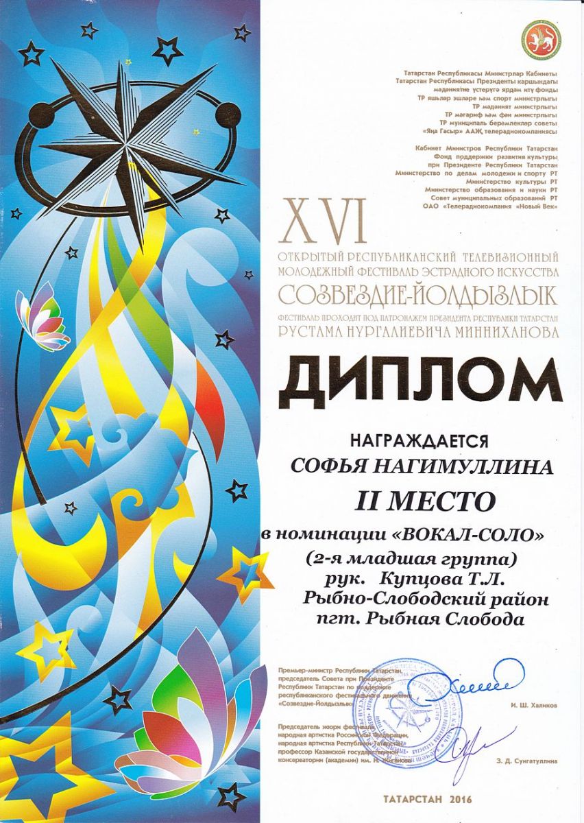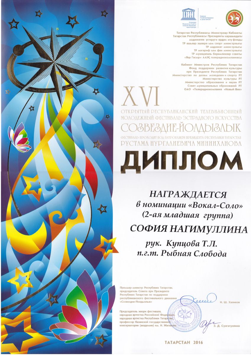 - София Нагимуллина - Диплом за II-е место XVI-го открытого Республиканского телевизионного молодежного фестиваля эстрадного искусства "Созвезие-Йолдызлык" в номинации "Вокал-соло" (2-я младшая группа). (2016г.)
