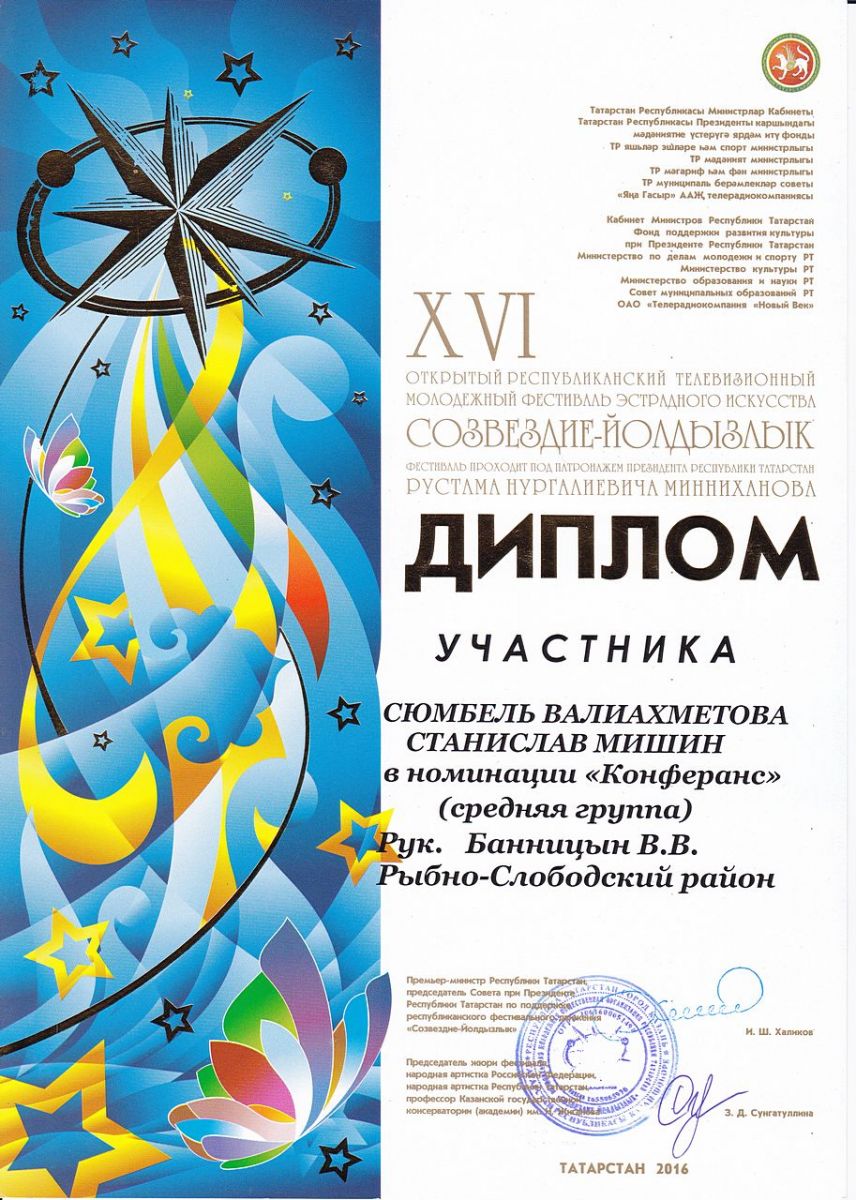 - Сюмбель Валиахметова и Стас Мишин - Диплом участника XVI-го открытого Республиканского телевизионного молодежного фестиваля эстрадного искусства "Созвезие-Йолдызлык" в номинации "Конферанс" (средняя группа). (2016г.)