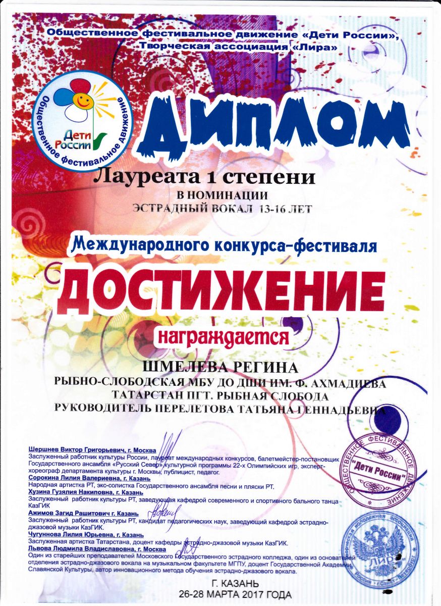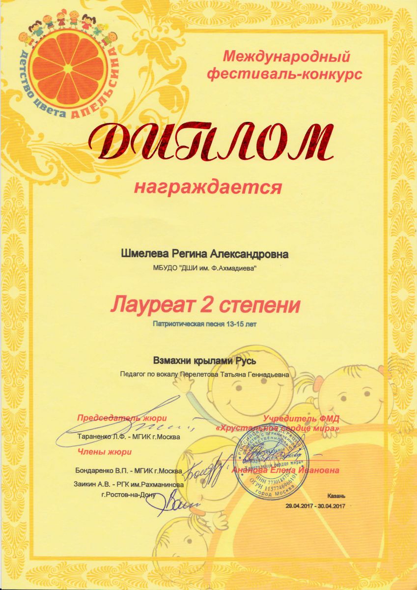 - Регина Шмелева - Диплом Лауреата II-й степени Международного фестиваля-конкурса "Детство цвета апельсина" ФМД "Хрустальное сердце мира" в номинации "Патриотическая песня. (13-15 лет)" (апрель 2017г.)