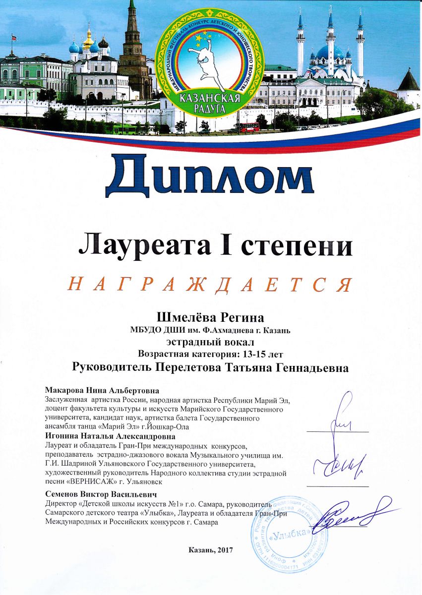 Регина Шмелева - Диплом Лауреата I-й степени Международного фестиваля-конкурса детского и юношеского творчества "Казанская радуга" в номинации "Эстрадный вокал. (13-15 лет)" (апрель 2017г.)