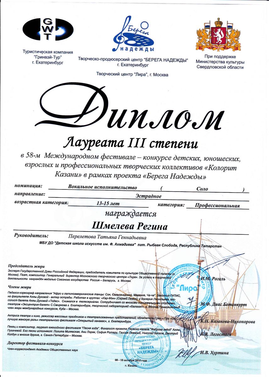 Регина Шмелева - Диплом Лауреата III-й степени Международного фестиваля-конкурса детских, юношеских, взрослых и профессиональных творческих коллективов "Колорит Казани" в рамках проекта "Берега Надежды" в номинации "Эстрадный вокал - Профессиональная категория 13-15 лет"(осень 2016г.)