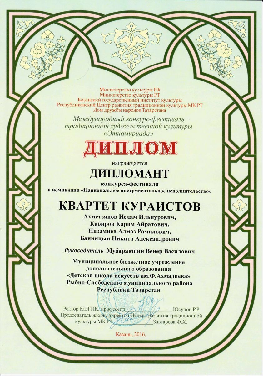 - Ансамбль кураистов "Райхан" - Диплом дипломанта Международного конкурса-фестиваля традиционной художественной "Этномириада" в номинации "Национальное инструментальное исполнительство" (осень 2016г.)