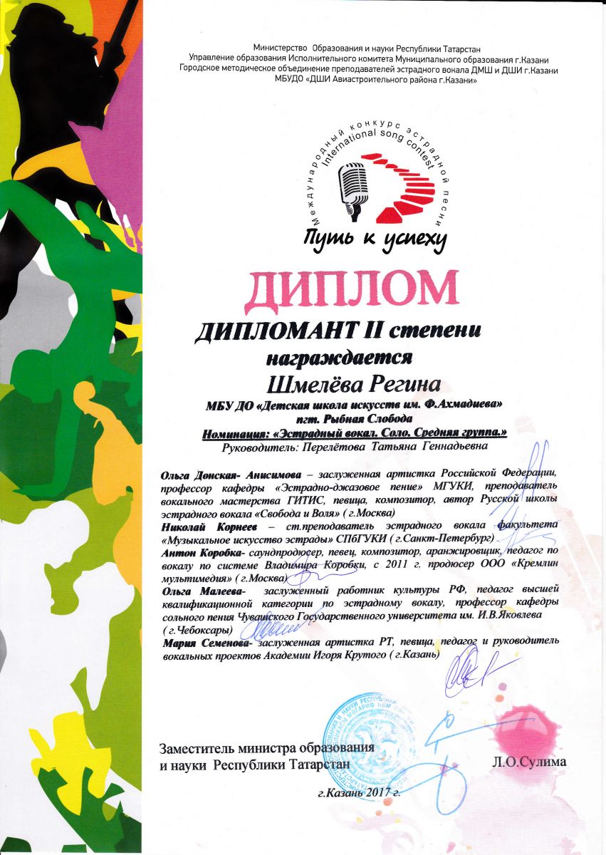 Регина Шмелёва - Диплом Лауреата II-й степени Международного фестиваля-конкурса детских, юношеских, молодежных, взрослых творческих коллективов и исполнителей "WORLD ART" в рамках творческого проекта "Адмиралтейская звезда" в номинации "Эстрадный вокал" (2017г.)