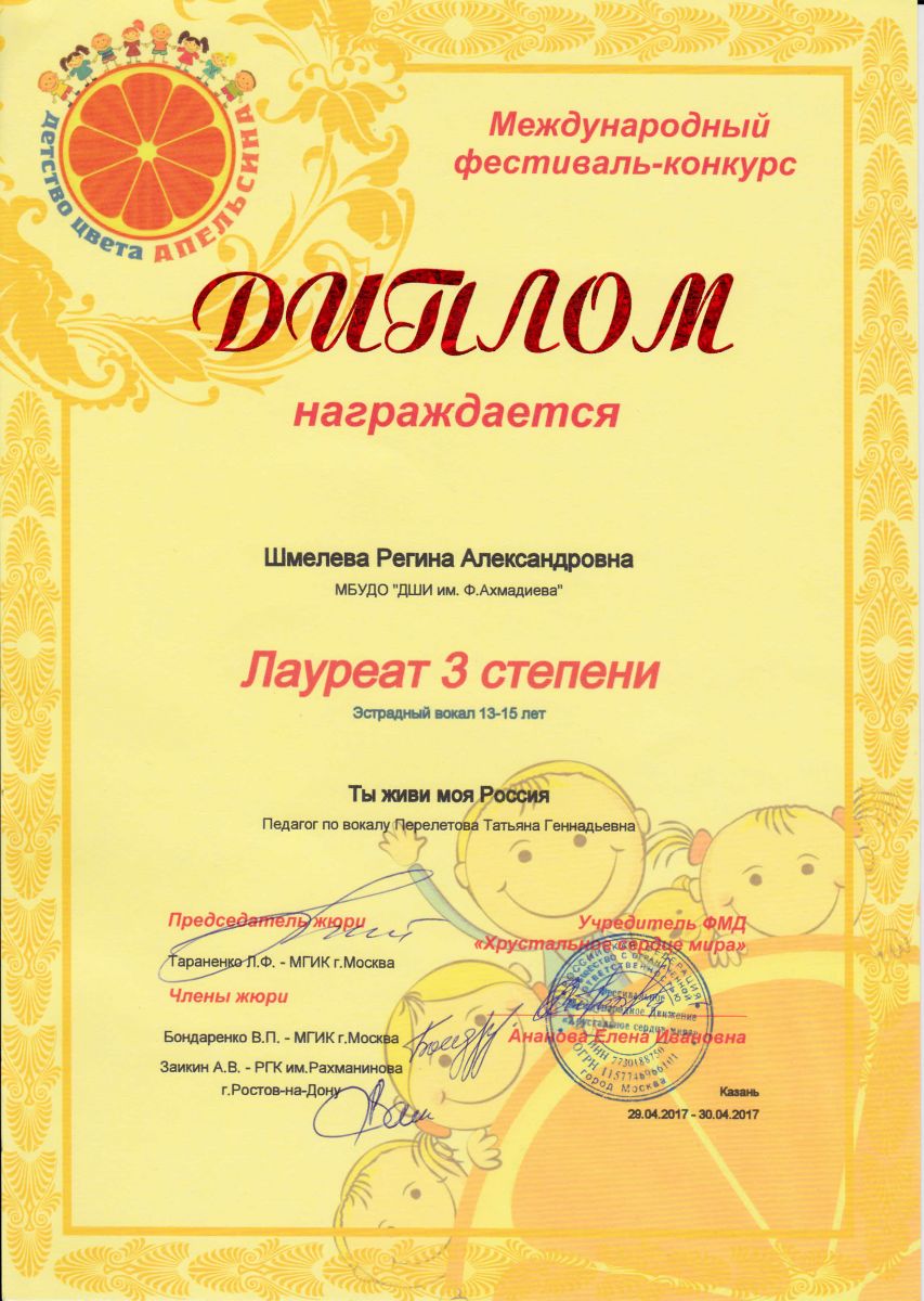 - Регина Шмелева - Диплом Лауреата III-й степени Международного фестиваля-конкурса "Детство цвета апельсина" ФМД "Хрустальное сердце мира" в номинации "Эстрадный вокал. (13-15 лет)" (апрель 2017г.)