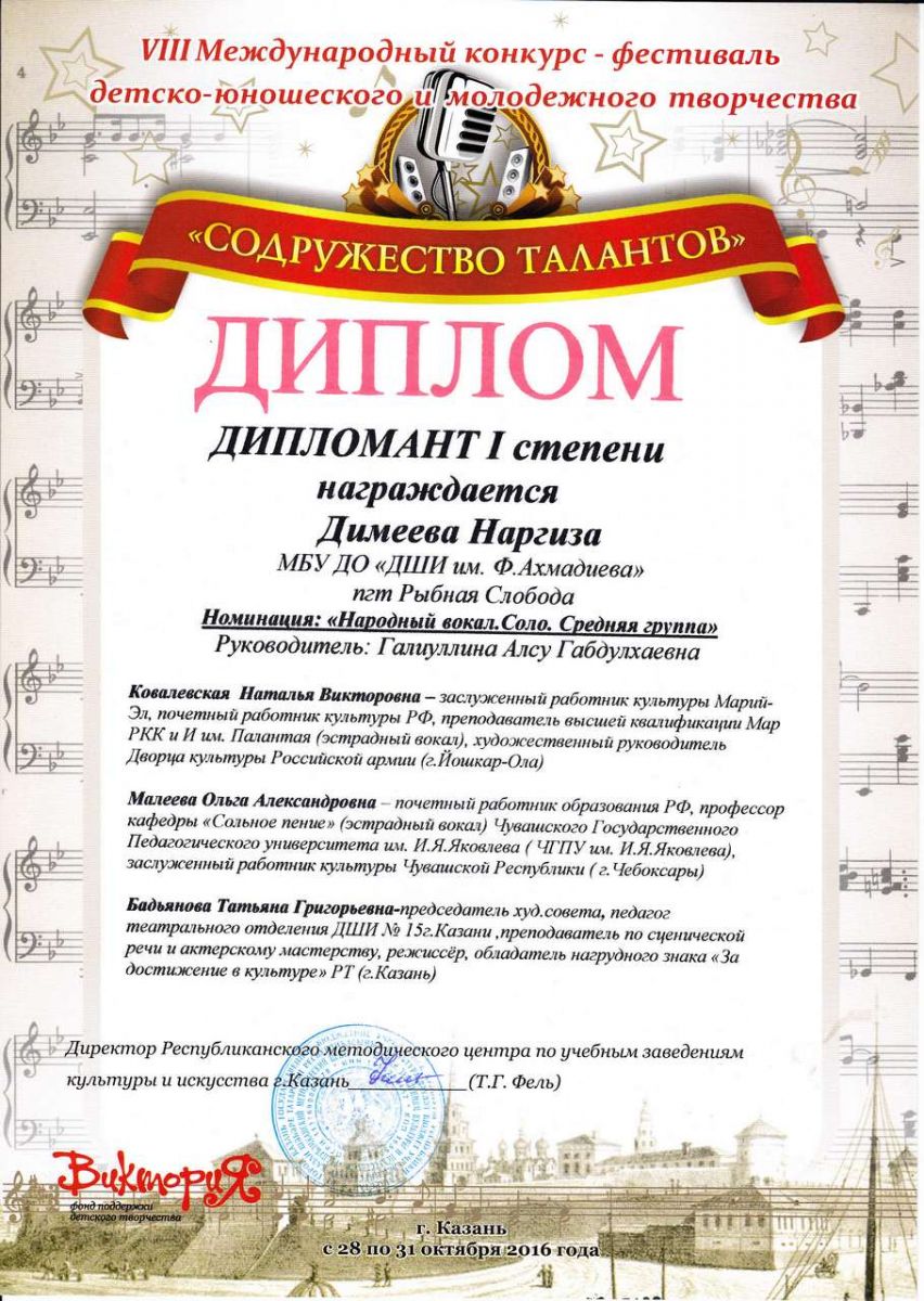 - Димеева Наргиза - Дипломант I-й степени VIII-го Международного конкурса-фестиваля детско-юношеского и молодежного творчества "Содружество талантов" в номинации "Народный вокал. Соло. Средняя группа" (октябрь 2016г.)