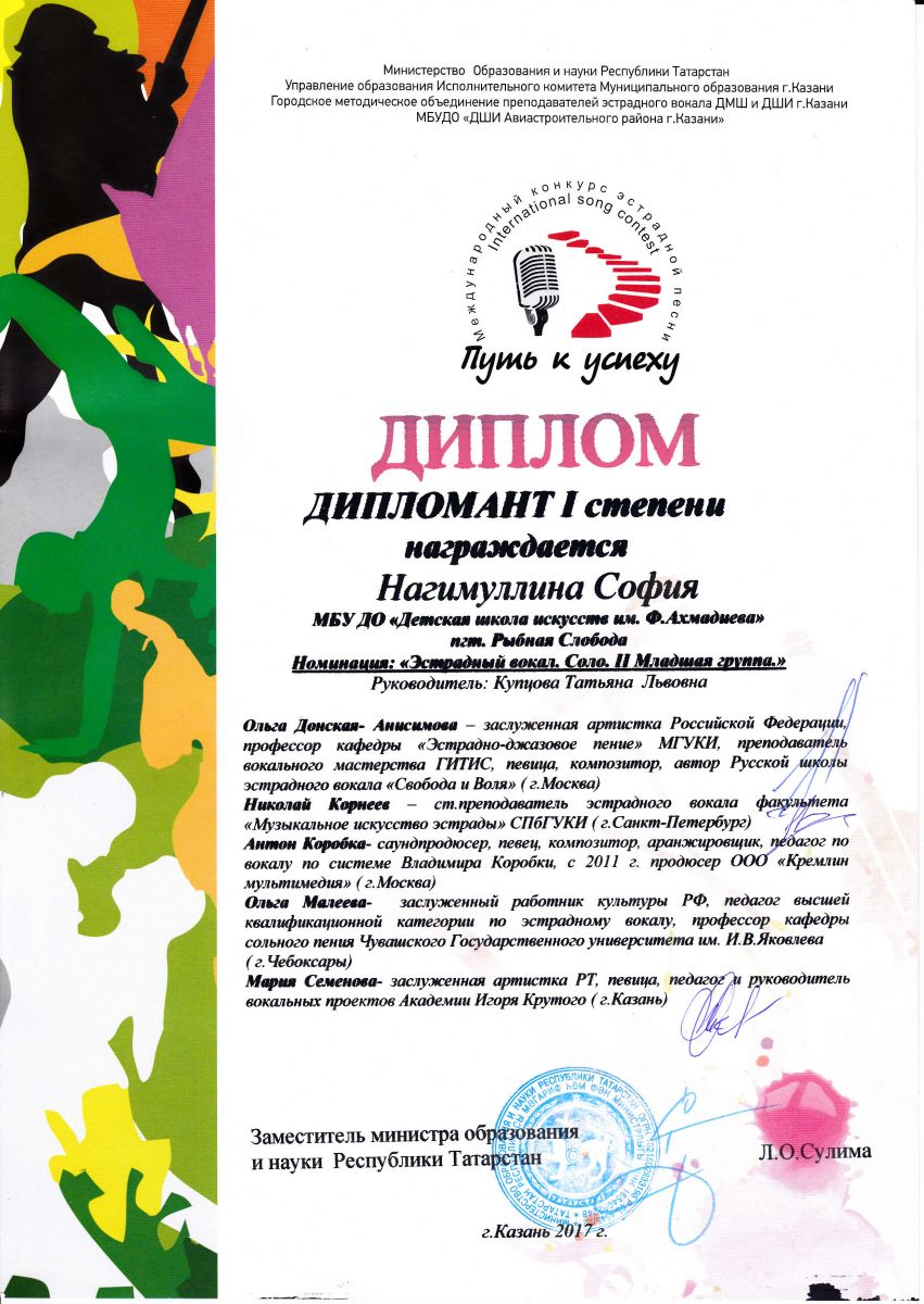 - София Нагимуллина - Диплом I-й степени Международного конкурса эстрадной песни "Путь к успеху" (февраль 2017г.)