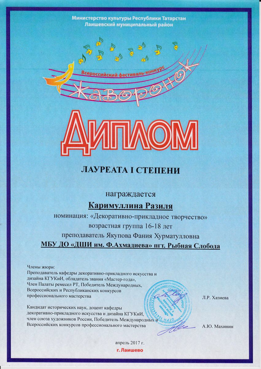 Каримуллина Разиля - Диплом лауреата I-й степени Всероссийского фестиваля-конкурса "Жаворонок" в номинации "Декоративно-прикладное творчество" (возрастная группа 16-18 лет)(апрель 2017г.)
