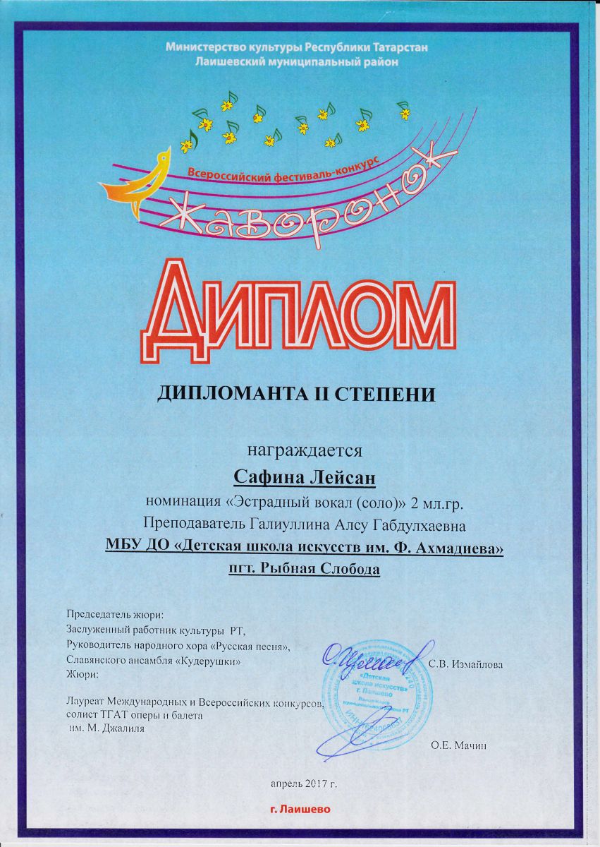 Лейсан Сафина - Диплом дипломанта II-й степени Всероссийского фестиваля-конкурса "Жаворонок" в номинации "Эстрадный вокал (соло)" (2-я младшая группа)(апрель 2017г.)