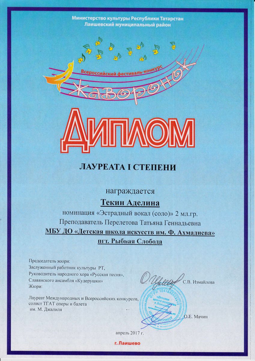 Аделина Текин - Диплом лауреата I-й степени Всероссийского фестиваля-конкурса "Жаворонок" в номинации "Эстрадный вокал (соло)" (2-я младшая группа )(апрель 2017г.)