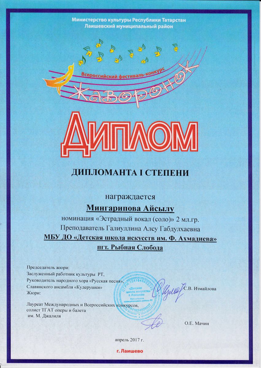 Айсылу Мингарипова - Диплом дипломанта I-й степени Всероссийского фестиваля-конкурса "Жаворонок" в номинации "Эстрадный вокал (соло)" (2-я младшая группа)(апрель 2017г.)