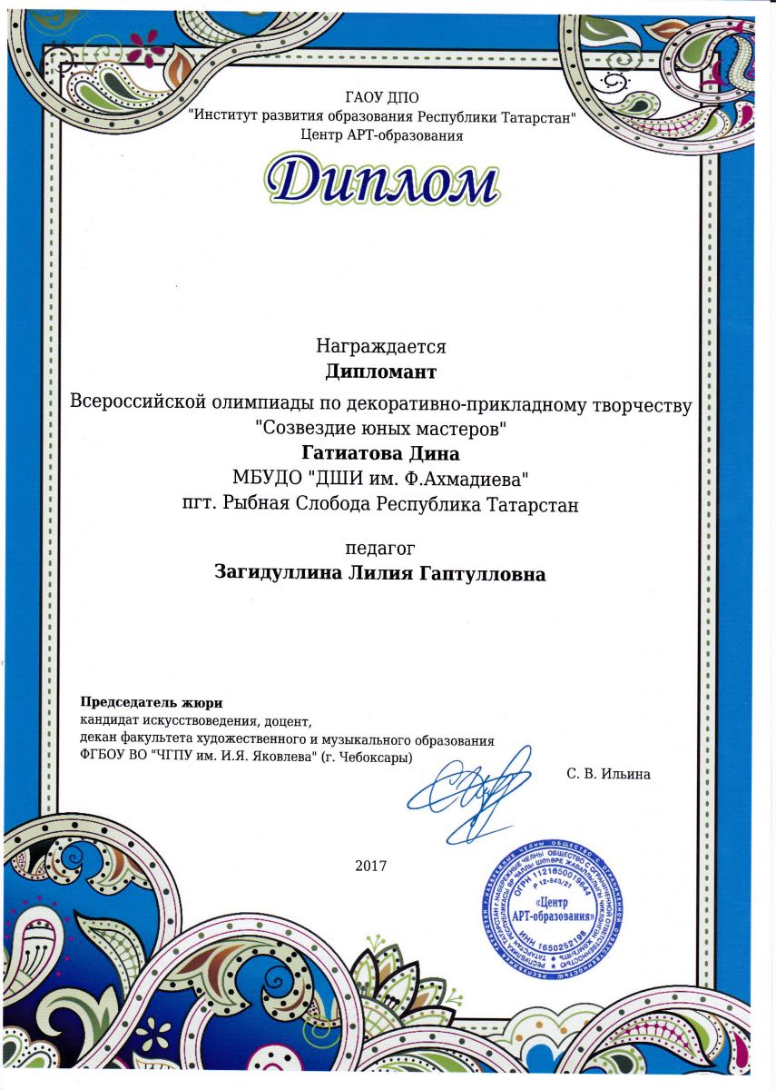 Гатиатова Дина - Диплом дипломанта Всероссийской олимпиады по декоративно-прикладному творчеству "Созвездие юных мастеров"(март 2017г.)