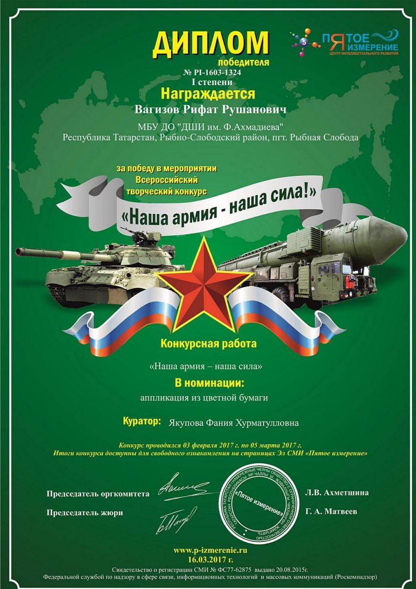 Вагизов Рифат  - Диплом победителя I-й степени Всероссийского творческого конкурса "Наша армия - наша сила!" в номинации "Декоративно-прикладное творчество"(март 2017г.)
