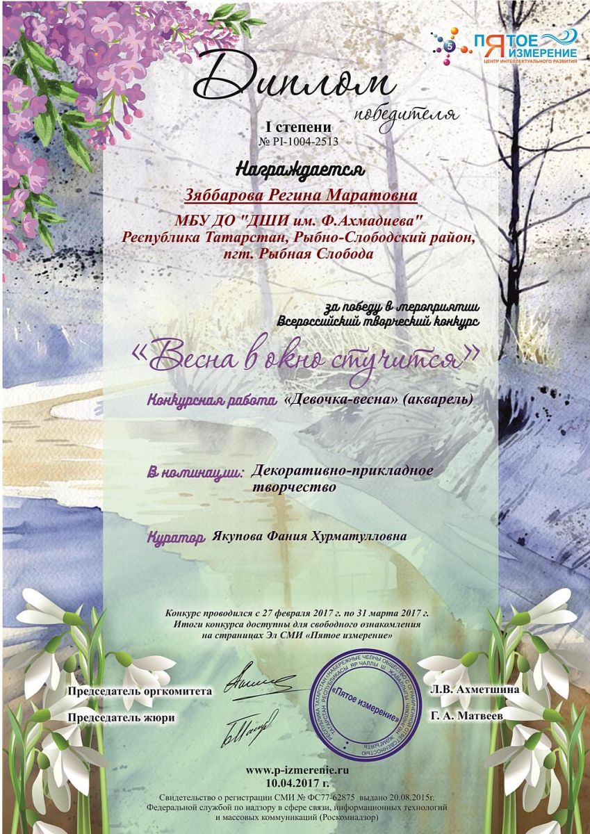 Зяббарова Регина - Диплом победителя I-й степени Всероссийского творческого конкурса "Весна в окно стучится" в номинации "Декоративно-прикладное творчество"(апрель 2017г.)