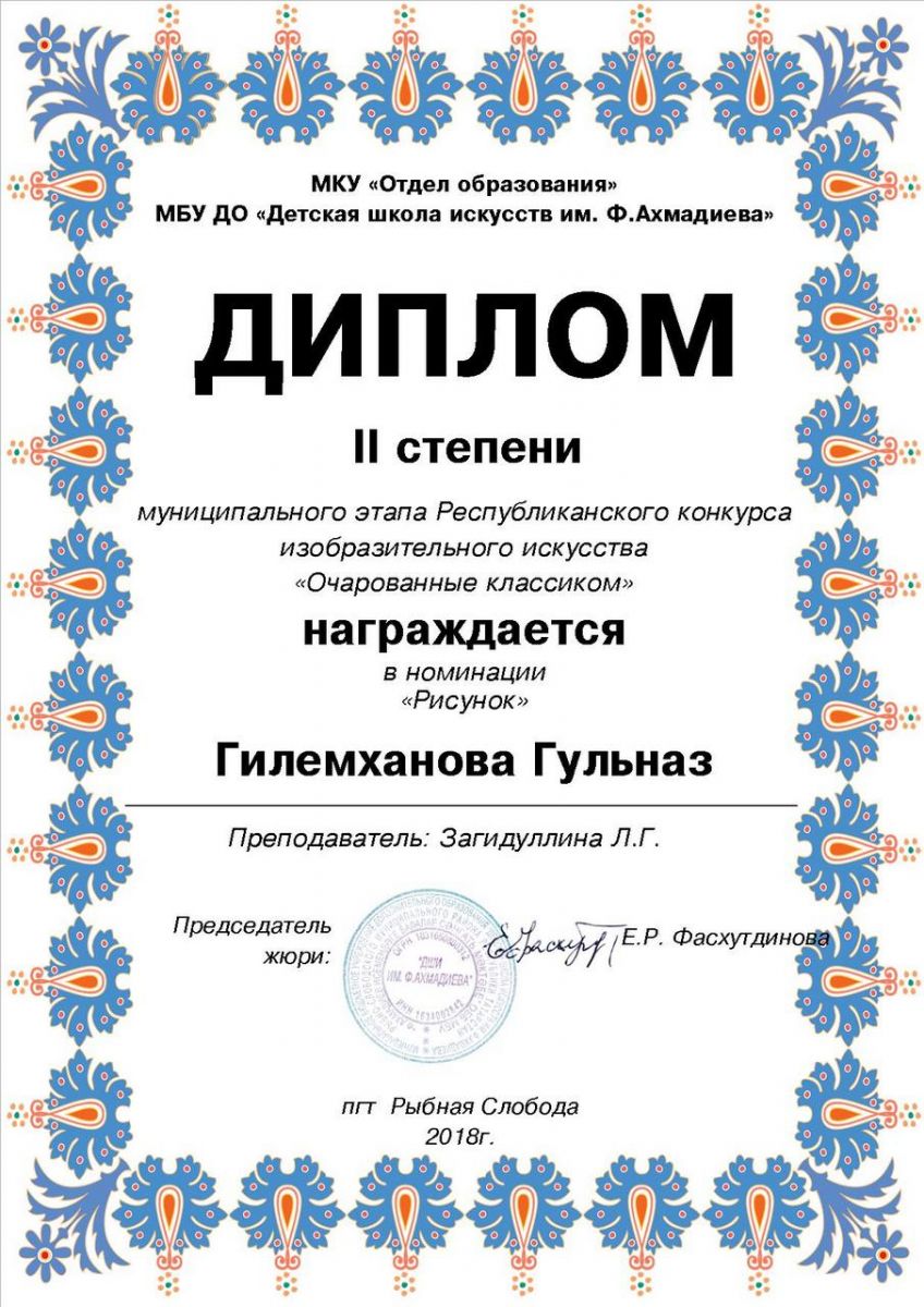 Гилемханова Гульназ - Диплом II-й степени муниципального этапа Республиканского конкурса изобразительного искусства "Очарованные классиком"(2018г.)