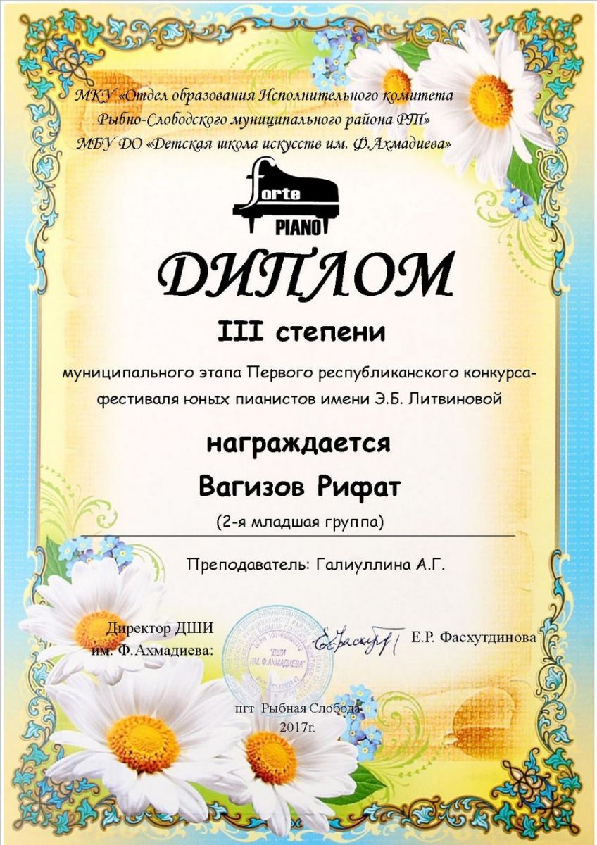 Вагизов Рифат - Диплом III-й степени муниципального этапа Первого Республиканского конкурса-фестиваля юнях пианистов имени Э.Б. Литвиновой "Forte-PIANO"(2-я младшая группа)(ноябрь 2017г.)