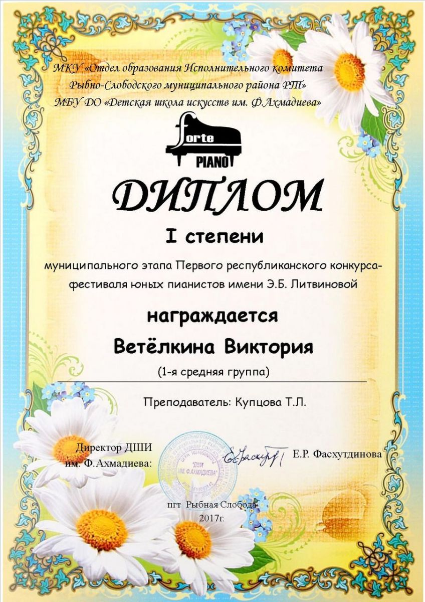 Ветёлкина Виктория - Диплом I-й степени муниципального этапа Первого Республиканского конкурса-фестиваля юнях пианистов имени Э.Б. Литвиновой "Forte-PIANO"(1-я средняя группа)(ноябрь 2017г.)
