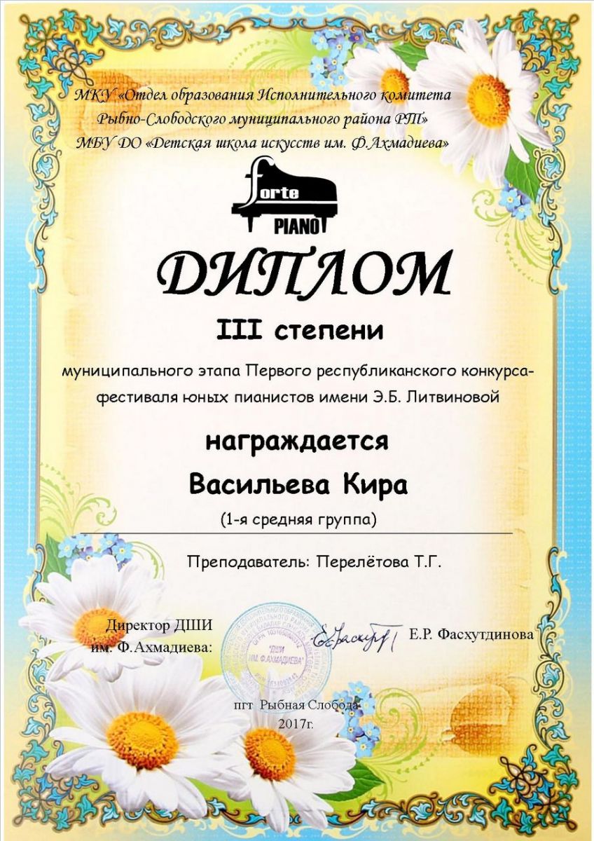 Васильева Кира - Диплом III-й степени муниципального этапа Первого Республиканского конкурса-фестиваля юнях пианистов имени Э.Б. Литвиновой "Forte-PIANO"(1-я средняя группа)(ноябрь 2017г.)
