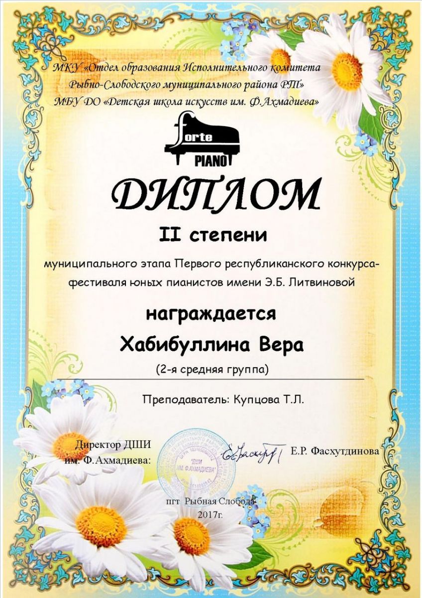 Хабибуллина Вера - Диплом II-й степени муниципального этапа Первого Республиканского конкурса-фестиваля юнях пианистов имени Э.Б. Литвиновой "Forte-PIANO"(2-я средняя группа)(ноябрь 2017г.)