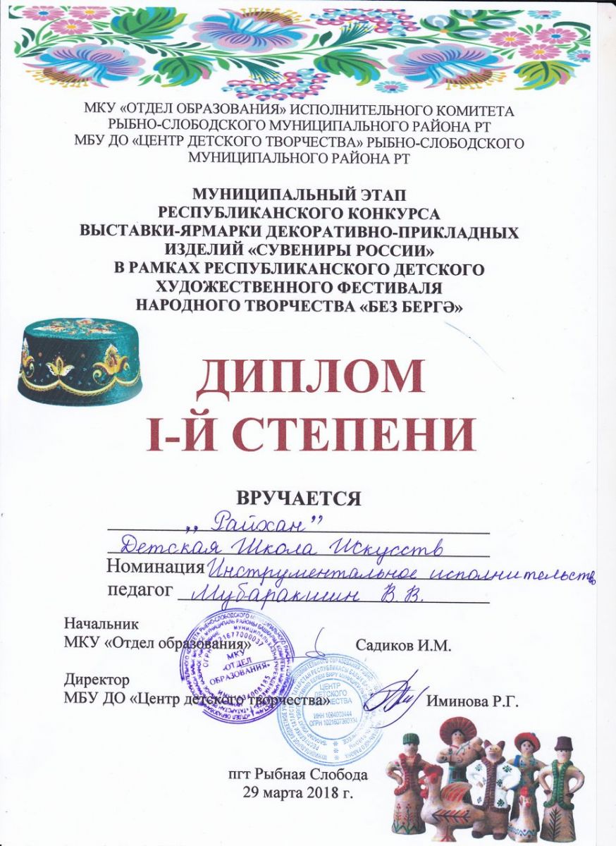 Ансамбль кураистов "Райхан" - Диплом I-й степени муниципального этапа Республиканского конкурса в рамках Республиканского детского художественного фестиваля народного творчества "БЕЗ БЕРГӘ" в номинации "Инструментальное исполнительство " (март 2018г.)