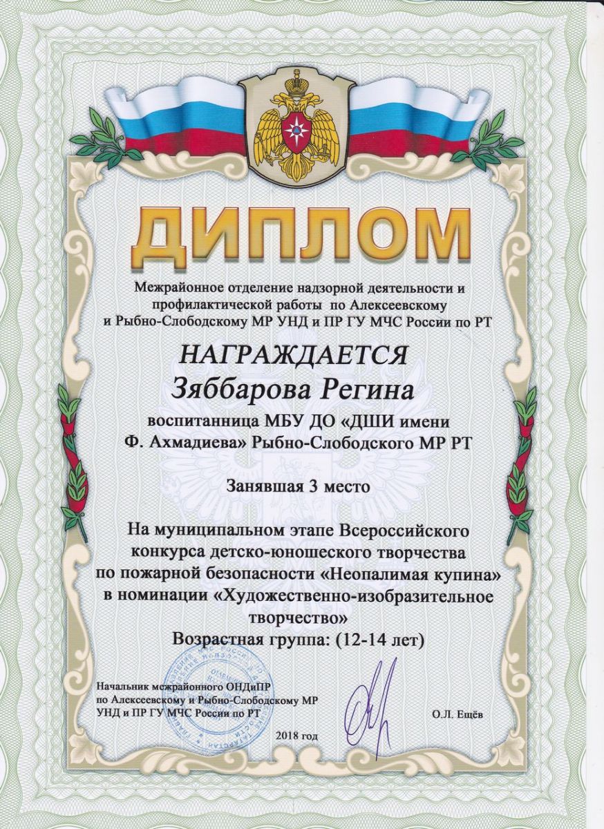 Регина Зяббарова - Диплом III-й степени муниципального этапа Всероссийского конкурса детско-юношеского творчества по пожарной безопасности "Неопалимая Купина" в номинации "Художественно-изобразительное творчество" (12-14 лет)(апрель 2018г.)