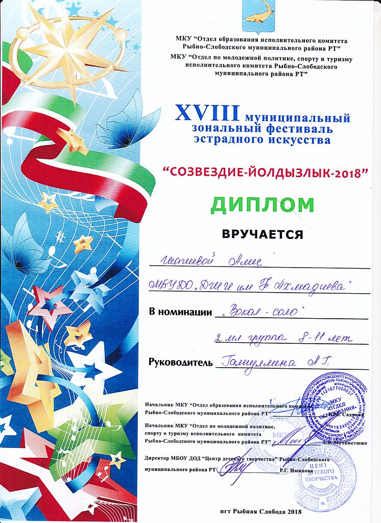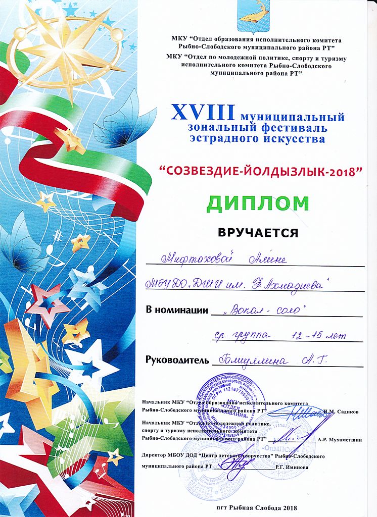 Мифтахова Алина - Диплом участника муниципального этапа XVIII-го Открытого республиканского телевизионного молодежного фестиваля эстрадного искусства«Созвездие-Йолдызлык-2018» в номинации "Вокал-соло.Средняя группа 12-15 лет "(февраль 2018г.)