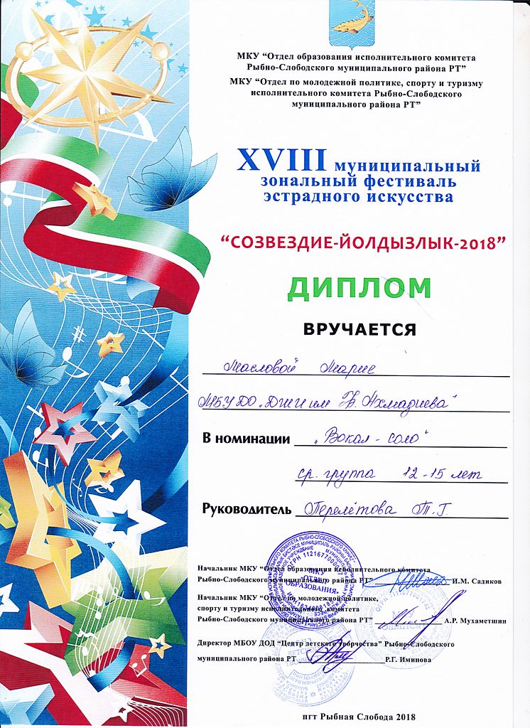 Маслова Мария - Диплом участника муниципального этапа XVIII-го Открытого республиканского телевизионного молодежного фестиваля эстрадного искусства«Созвездие-Йолдызлык-2018» в номинации "Вокал-соло. Сред. группа12-15 лет"(февраль 2018г.)