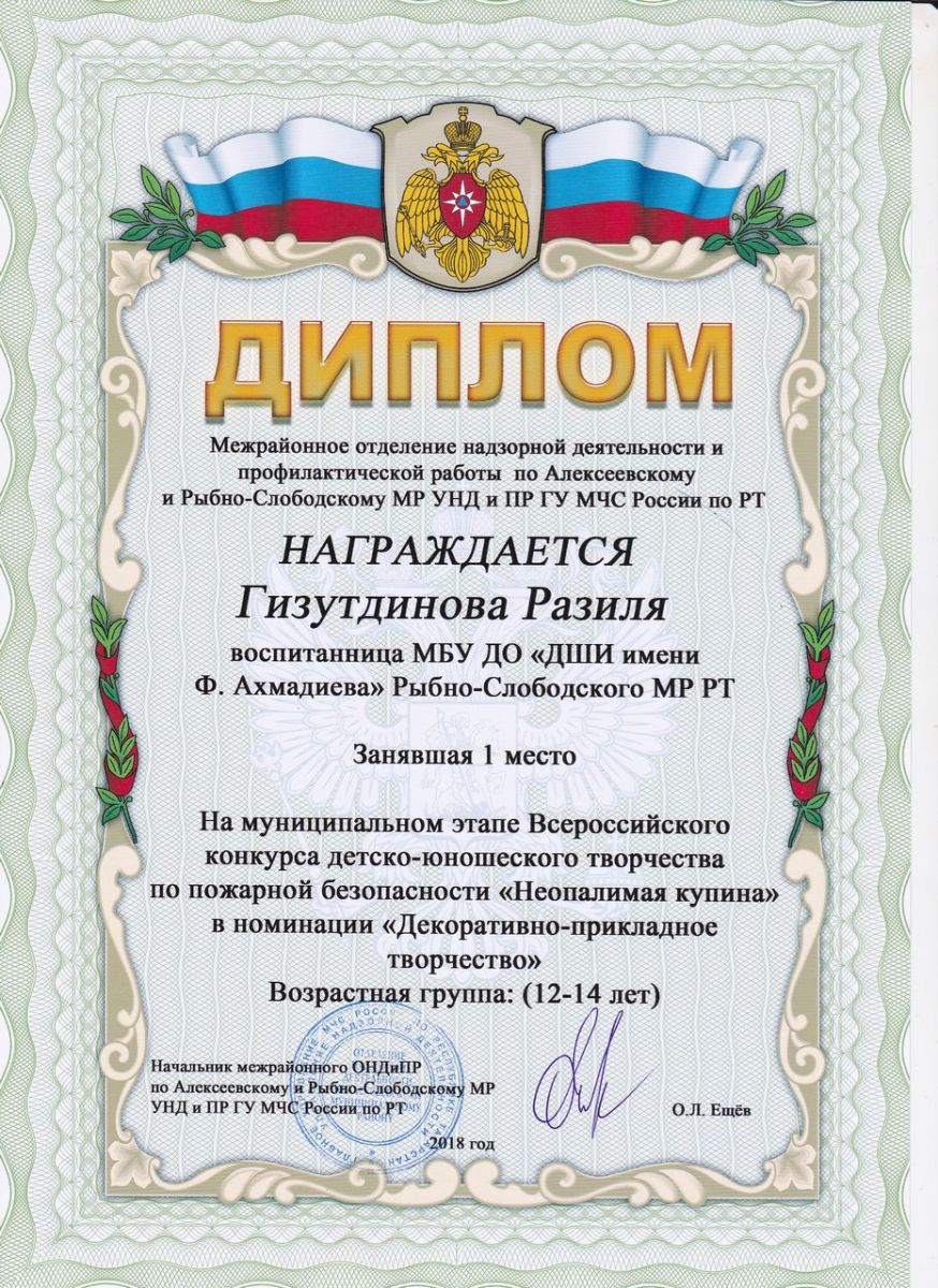 Разиля Гизутдинова - Диплом I-й степени муниципального этапа Всероссийского конкурса детско-юношеского творчества по пожарной безопасности "Неопалимая Купина" в номинации "Декоративно-прикладное творчество" (12-14 лет)(апрель 2018г.)