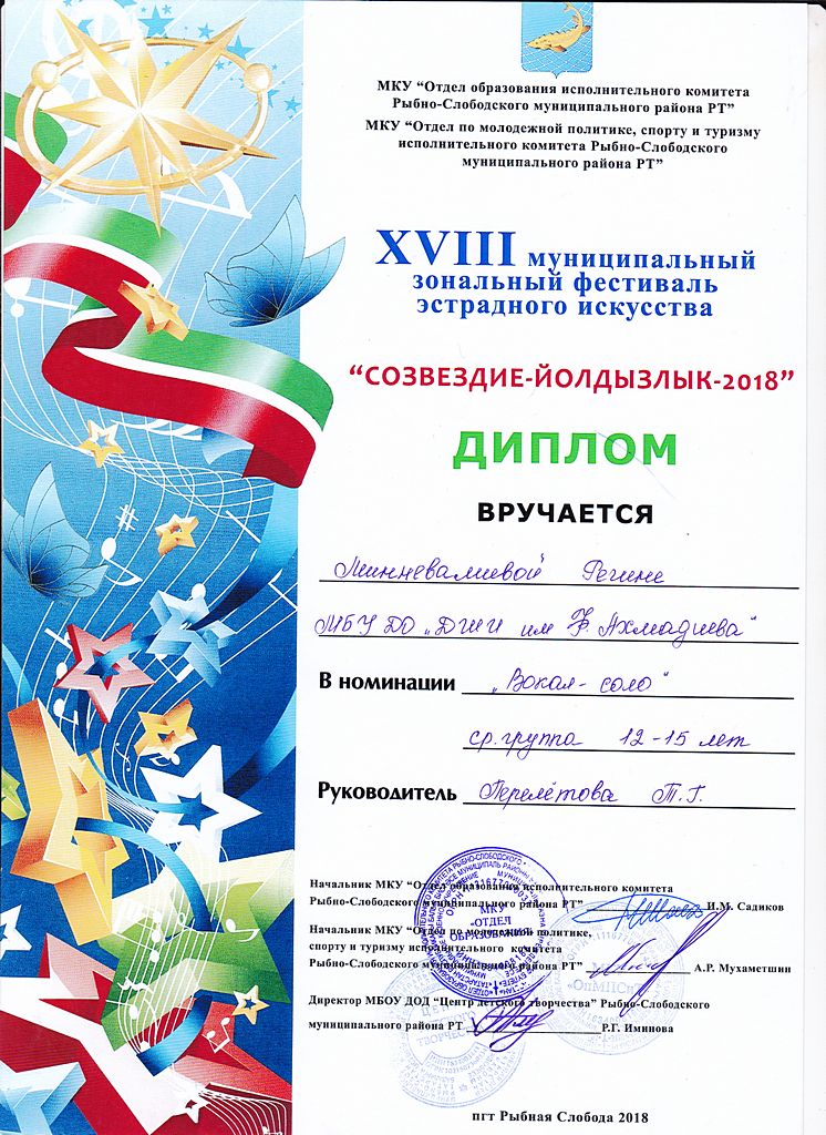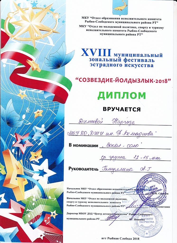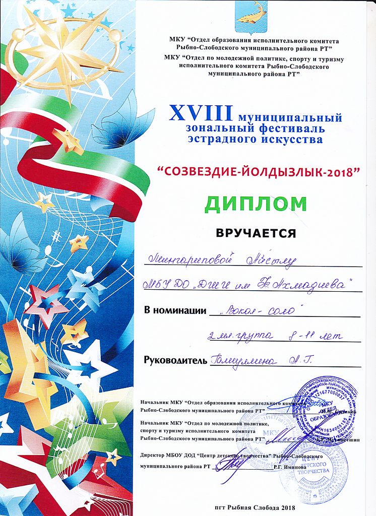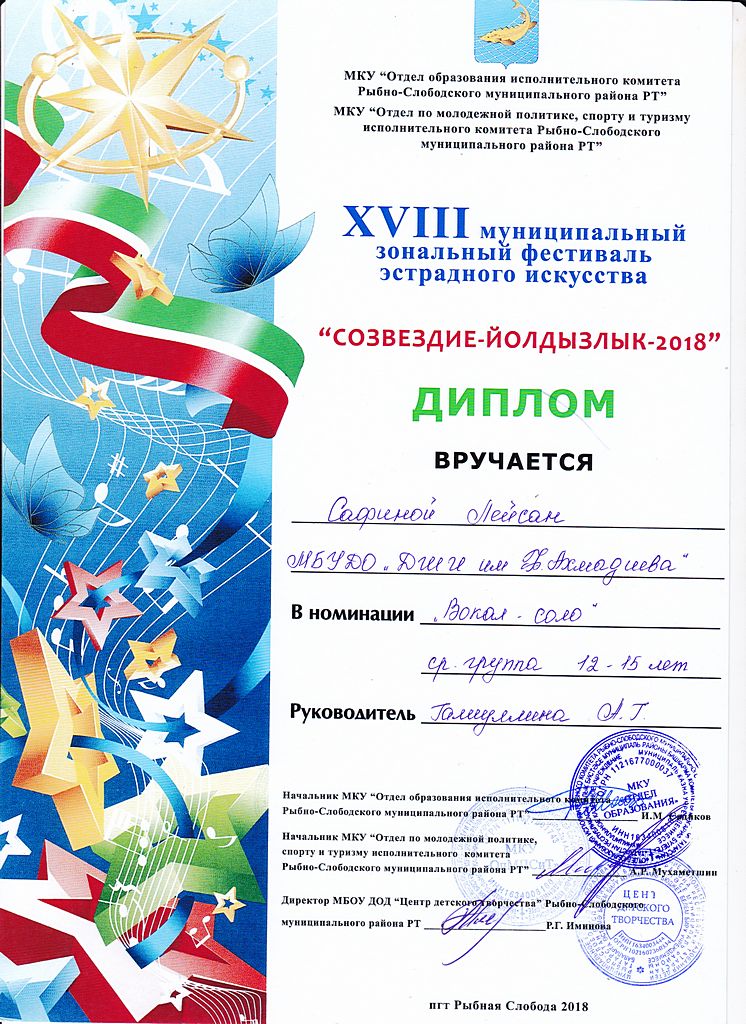 Сафина Лейсан - Диплом участника муниципального этапа XVIII-го Открытого республиканского телевизионного молодежного фестиваля эстрадного искусства«Созвездие-Йолдызлык-2018» в номинации "Вокал-соло. Средняя группа 12-15 лет"(февраль 2018г.)