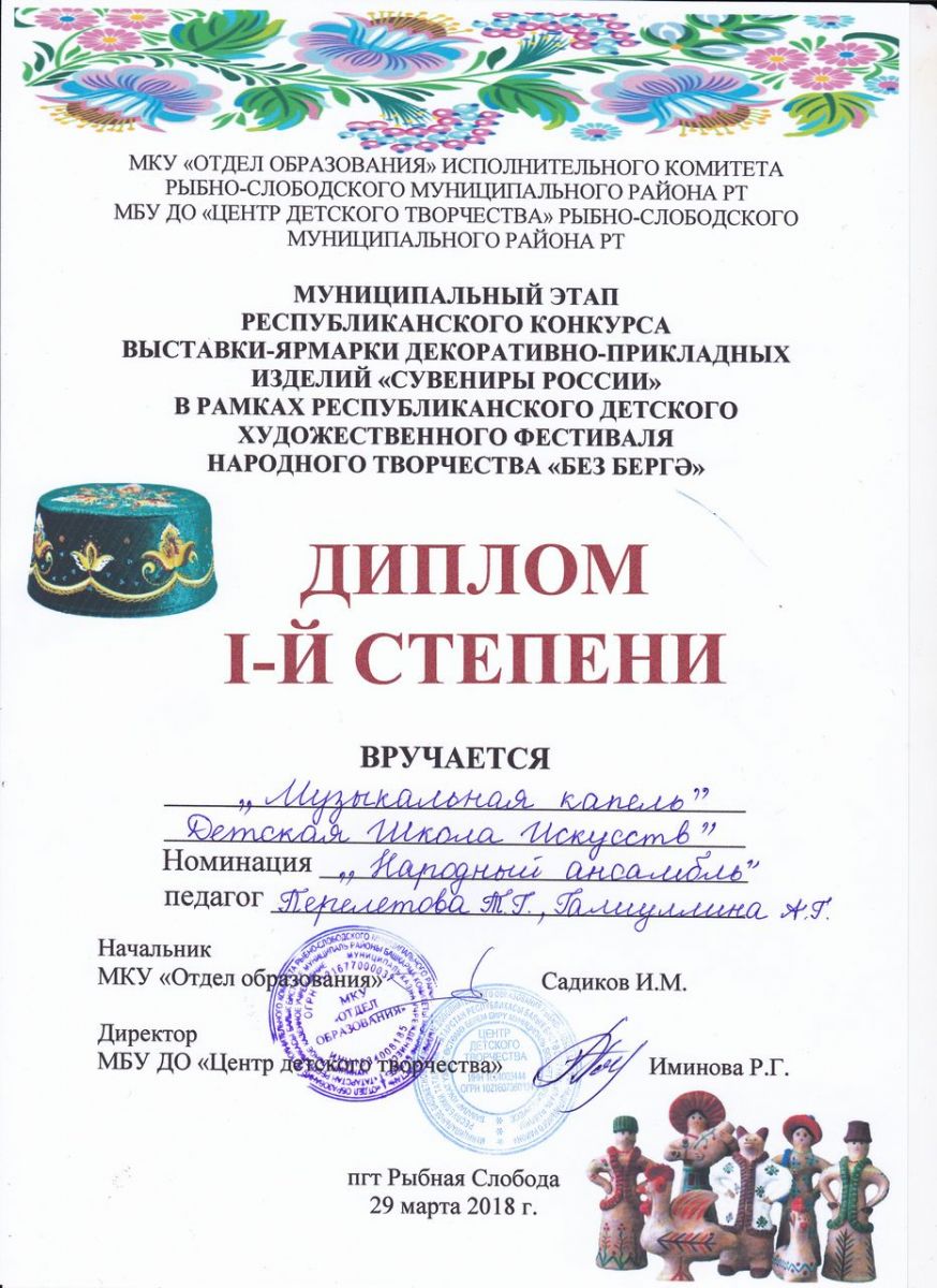 Вокальный ансамбль "Музыкальная капель" - Диплом I-й степени муниципального этапа Республиканского конкурса в рамках Республиканского детского художественного фестиваля народного творчества "БЕЗ БЕРГӘ" в номинации "Народный ансамбль" (март 2018г.)