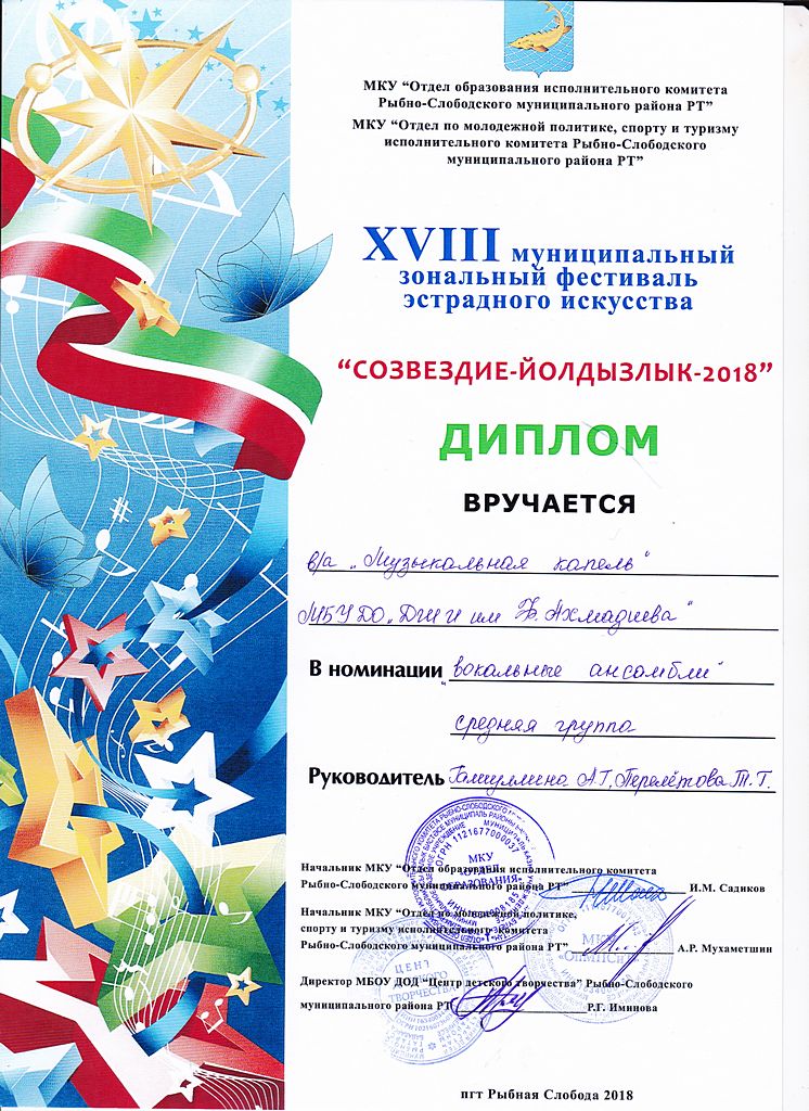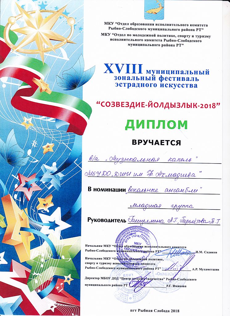 Вокальный ансамбль "Музыкальная капель" - Диплом участника муниципального этапа XVIII-го Открытого республиканского телевизионного молодежного фестиваля эстрадного искусства«Созвездие-Йолдызлык-2018» в номинации "Вокальные ансамбли. Средняя группа"(февраль 2018г.)