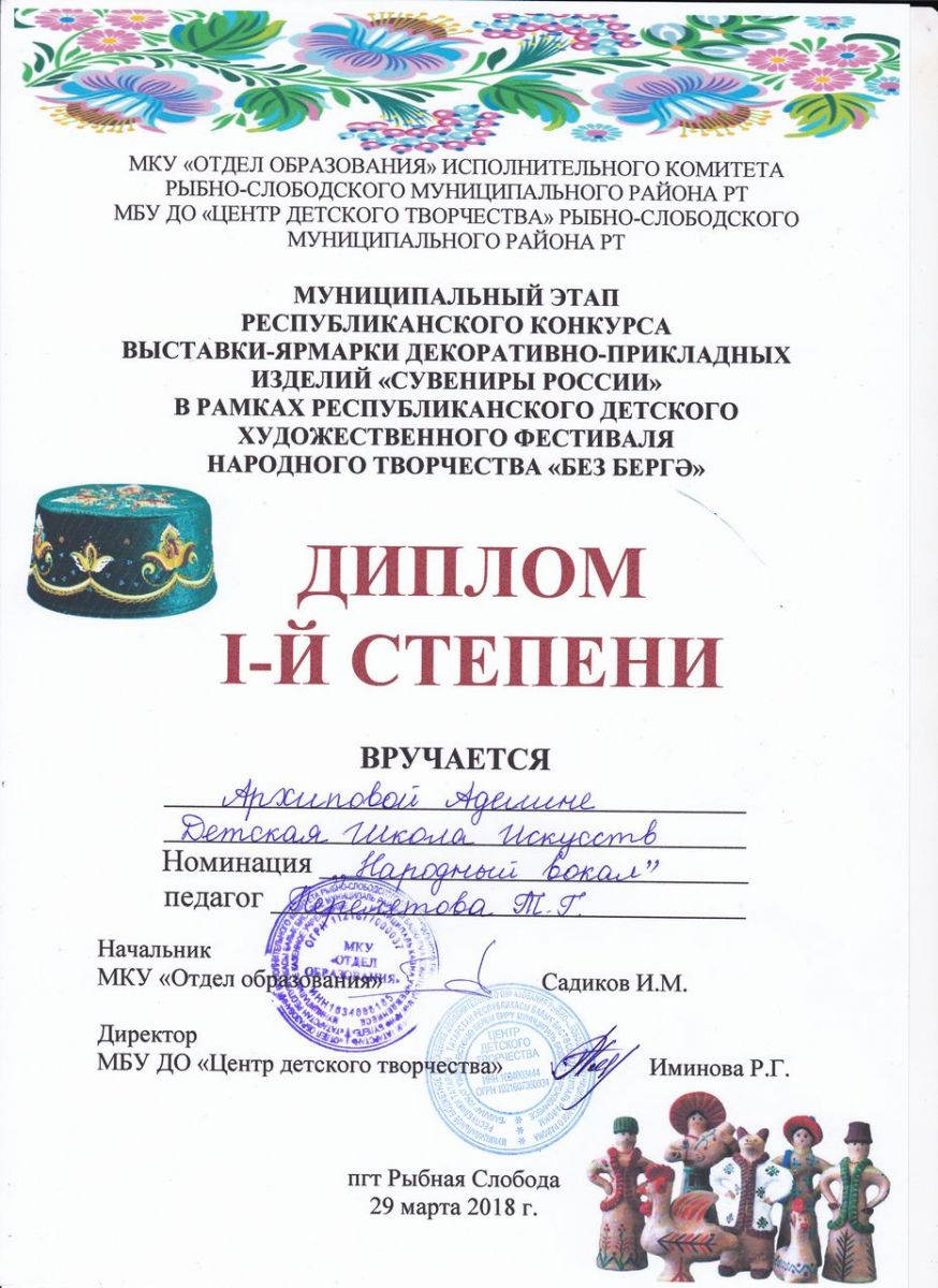 Архипова Аделина - Диплом I-й степени муниципального этапа Республиканского конкурса в рамках Республиканского детского художественного фестиваля народного творчества "БЕЗ БЕРГӘ" в номинации "Народный вокал" (март 2018г.)