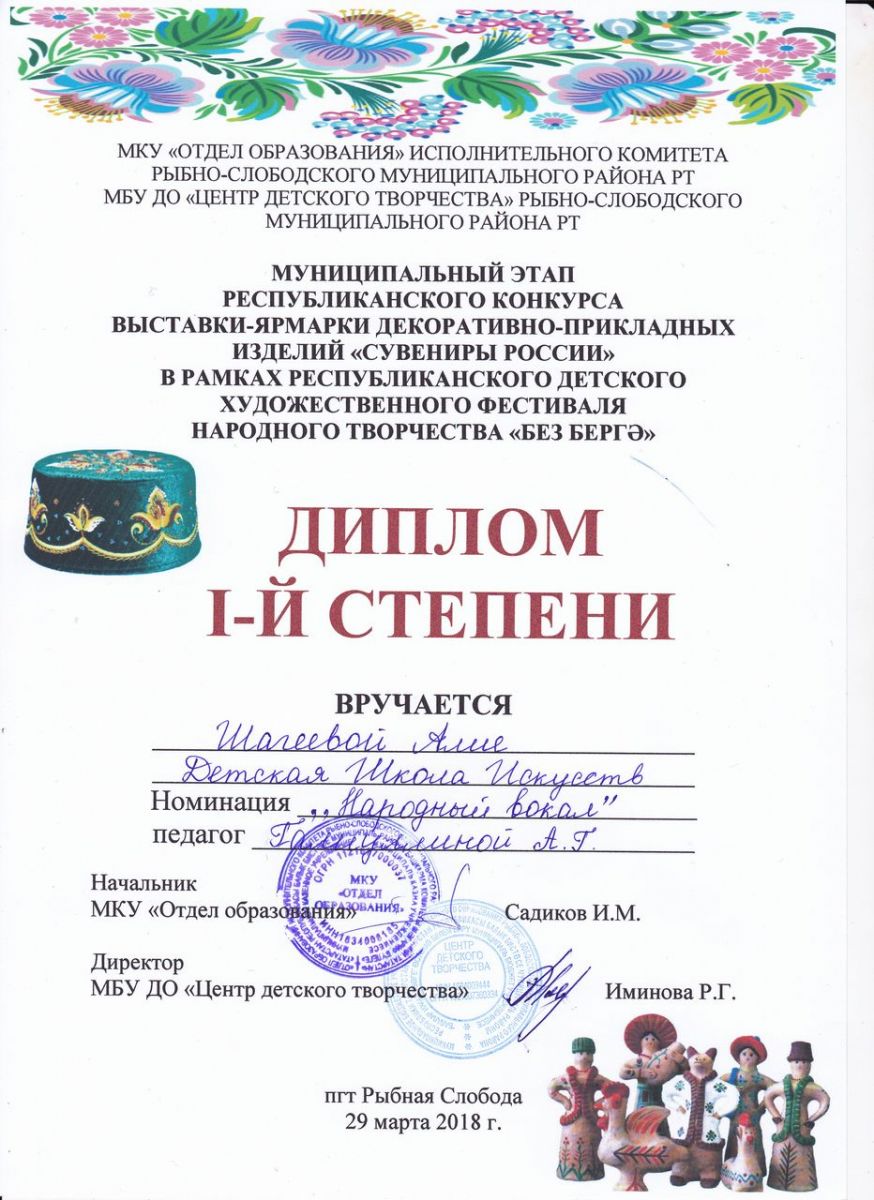 Шагиева Алия - Диплом I-й степени муниципального этапа Респубиканского конкурса в рамках Республиканского детского художественного фестиваля народного творчества "БЕЗ БЕРГӘ" в номинации "Народный вокал" (март 2018г.)