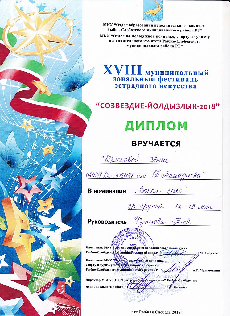 Крюкова Анна - Диплом участника муниципального этапа XVIII-го Открытого республиканского телевизионного молодежного фестиваля эстрадного искусства«Созвездие-Йолдызлык-2018» в номинации "Вокал-соло. Средняя группа 12-15 лет"(февраль 2018г.)