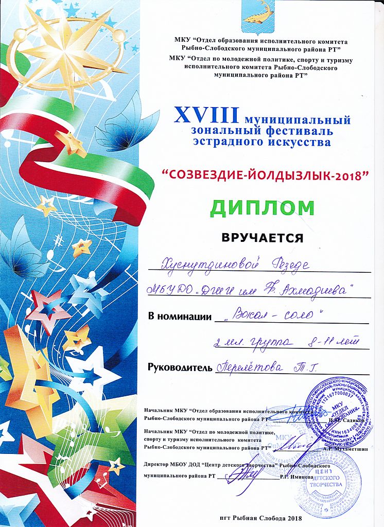 Хуснутдинова Резеда - Диплом участника муниципального этапа XVIII-го Открытого республиканского телевизионного молодежного фестиваля эстрадного искусства«Созвездие-Йолдызлык-2018» в номинации "Вокал-соло. 2-я младш. группа 8-11 лет"(февраль 2018г.)
