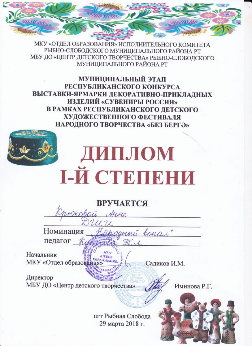 Крюкова Анна - Диплом I-й степени муниципального этапа Респубиканского конкурса в рамках Республиканского детского художественного фестиваля народного творчества "БЕЗ БЕРГӘ" в номинации "Народный вокал" (март 2018г.)