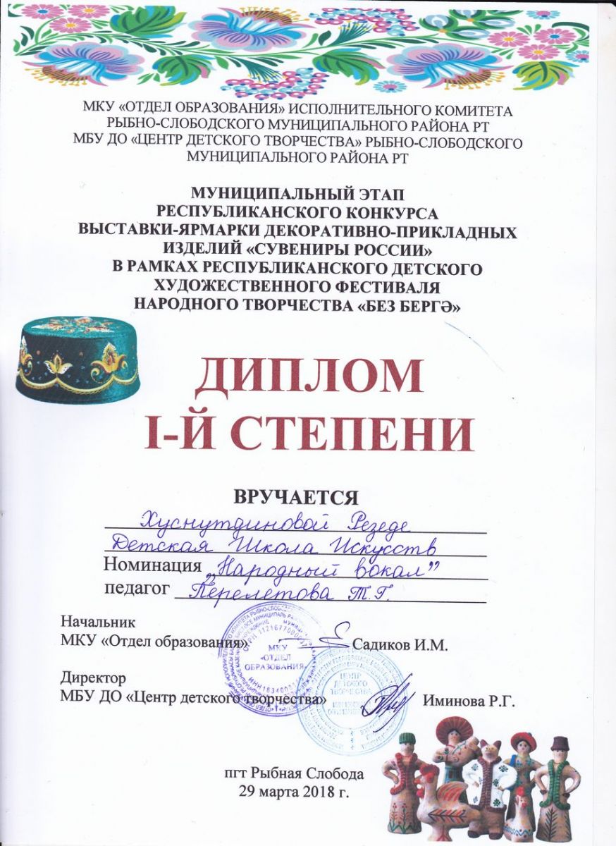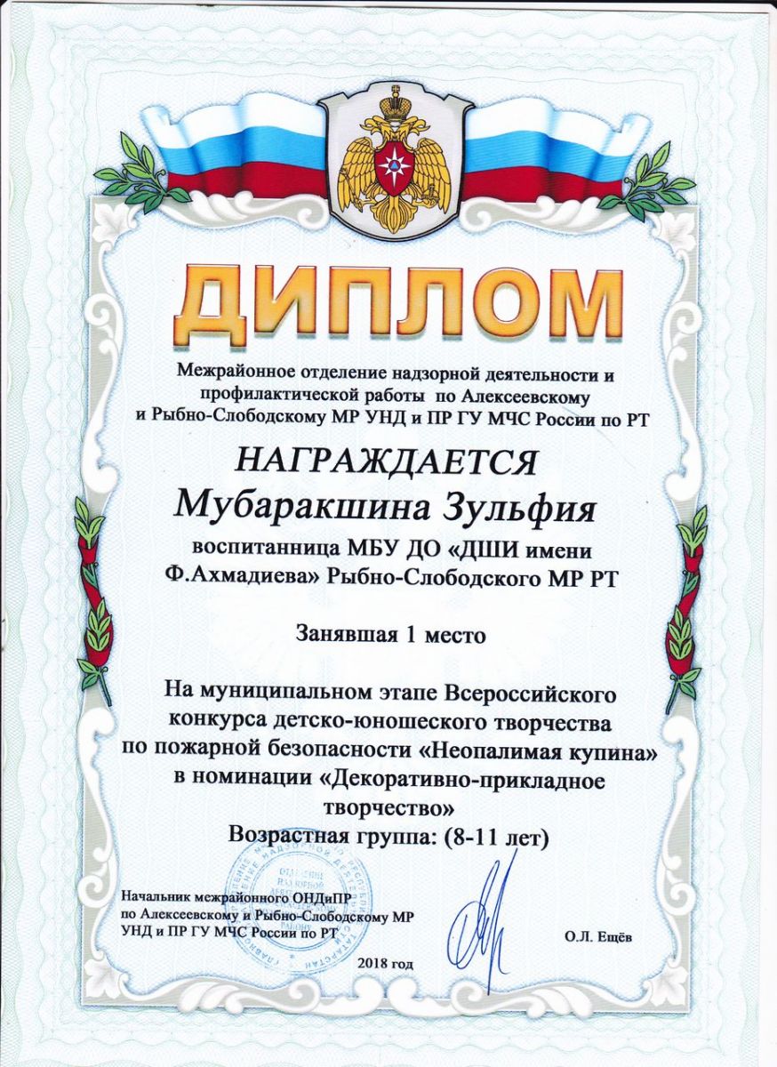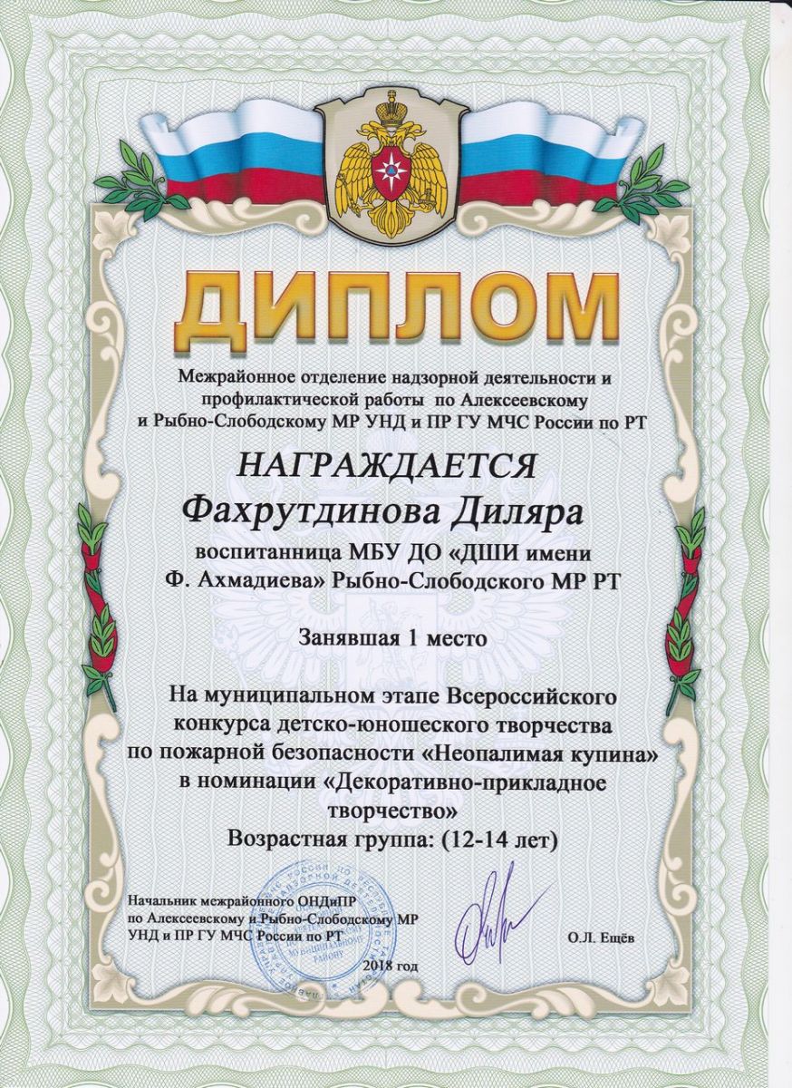 Диляра Фахрутдинова - Диплом I-й степени муниципального этапа Всероссийского конкурса детско-юношеского творчества по пожарной безопасности "Неопалимая Купина" в номинации "Декоративно-прикладное творчество" (12-14 лет)(апрель 2018г.)