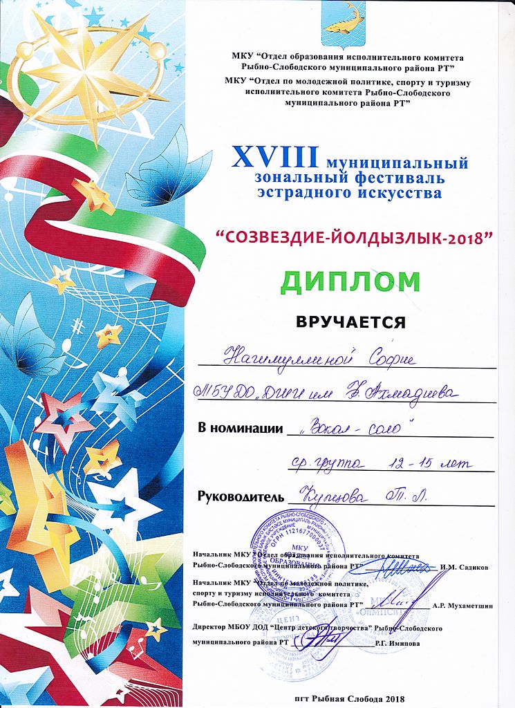 Нагимуллина София - Диплом участника муниципального этапа XVIII-го Открытого республиканского телевизионного молодежного фестиваля эстрадного искусства«Созвездие-Йолдызлык-2018» в номинации "Вокал-соло. Средняя группа 12-15 лет"(февраль 2018г.)